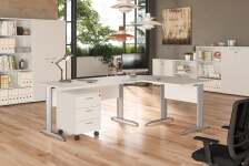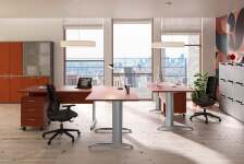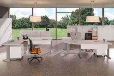 Linea arredo Base Plus si presenta con gambe a L in metallo con piedini regolabili. Linea coordinabile con tavolo riunioni, cassettiere, armadi bassi, medi e alti.