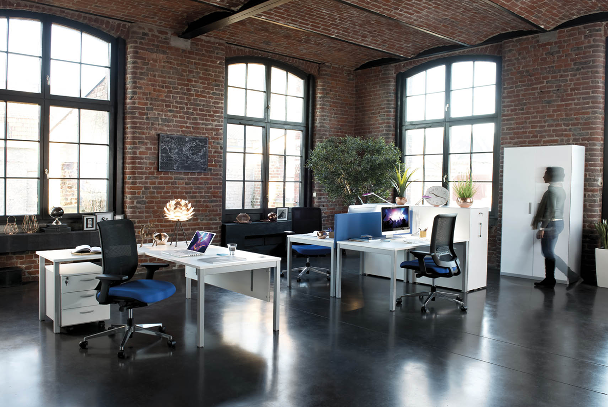 Con la sua base metallica a forma di arco saldato, la gamma Squadra si integra facilmente in qualsiasi ambiente di lavoro, sia classico che contemporaneo. È altamente modulare e consente di creare una varietà di configurazioni individuali per l'ufficio, grazie a ripiani e piedistalli sospesi.