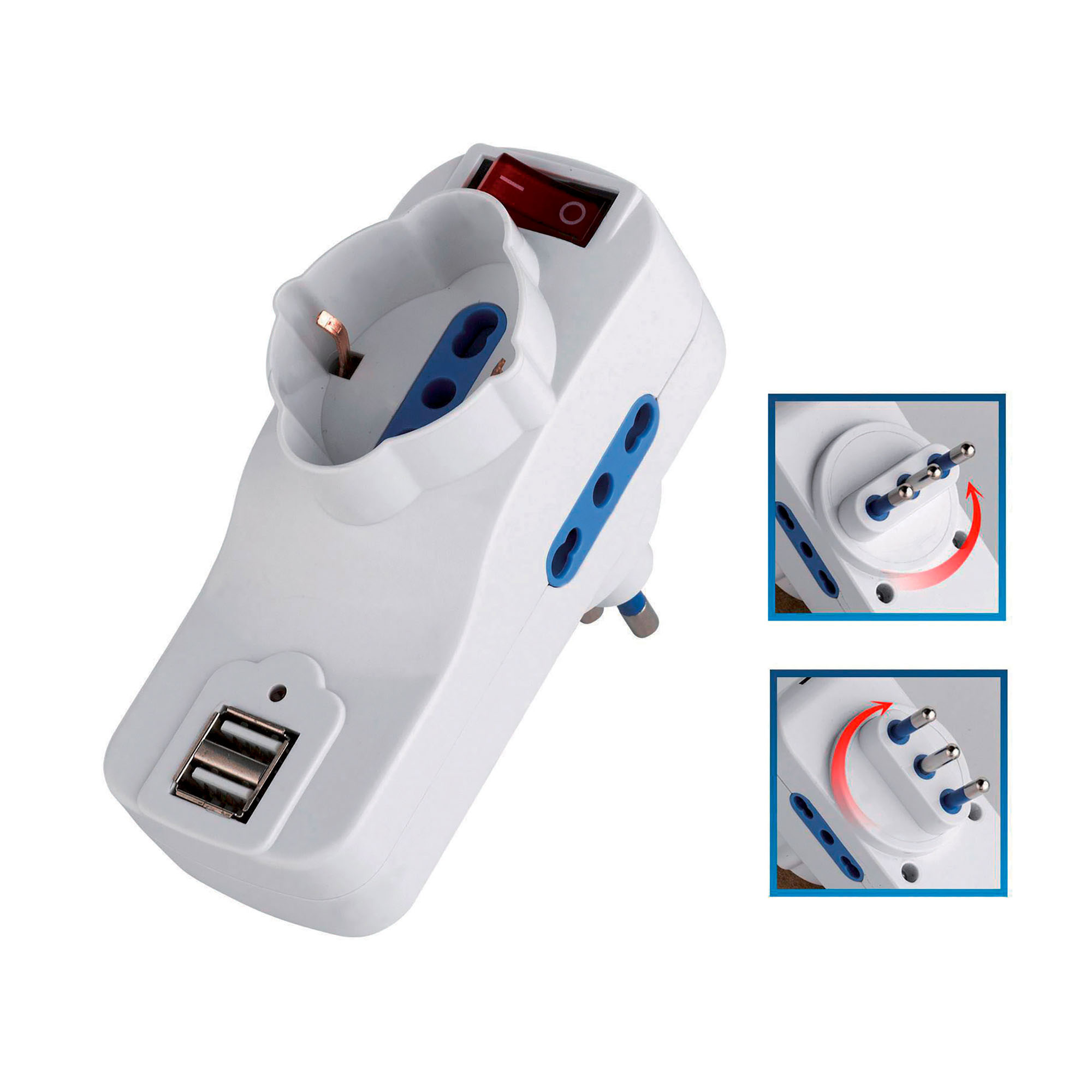 Detailled descriptionKeep your home fully covered.Adaptor with rotating plug.Adapter with rotating plug 16A, switch, 2 sockets 10A Bypass / 16A, 1 schuko / bypass 10 / 16A, 2 USB sockets