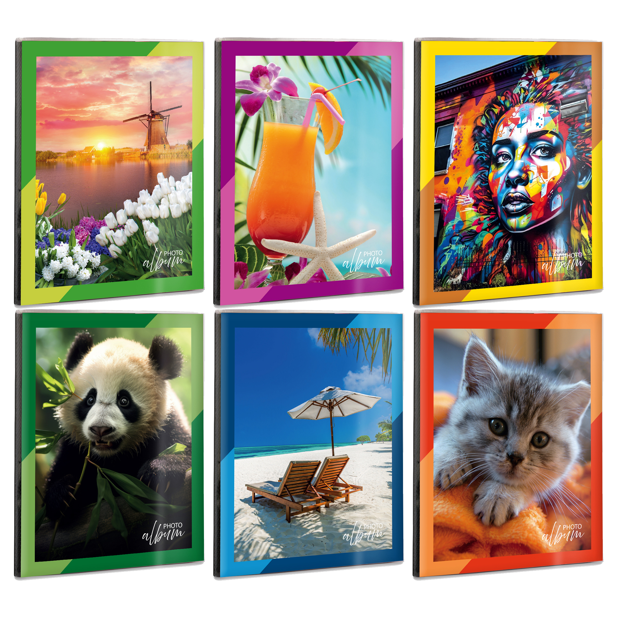 Detailled descriptionAlbum portafoto a busta saldati sul dorso. Confezioni con copertine assortite con buste bianche e nere. 24 foto da 10x15cm. Formato 12,5 x 16,5cm.