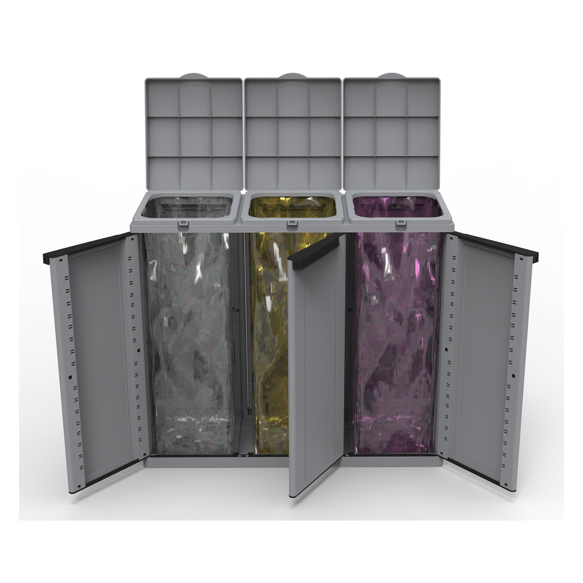 Armadietto a due ante ideato per la raccolta differenziata dei rifiuti.