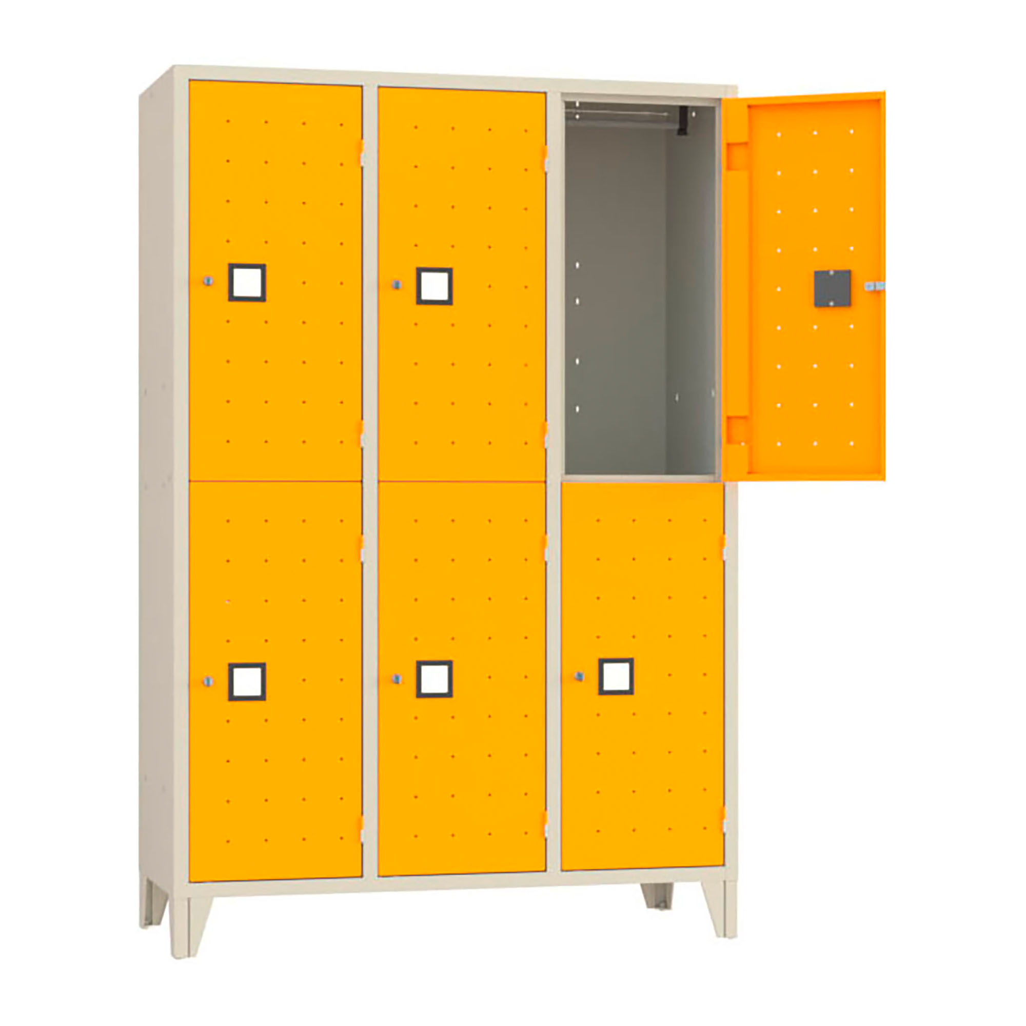 • Il vano interno ha la capacità di poter inserire un casco oppure borsette da grandi formati • Armadio casellario monoblocco 6 posti • Struttura dell’armadio Grigio ral 7035 • Ante dotate di cerniere interne con perno di rotazione esterno a 180 °con cerniera antieffrazione, fori quadri di aerazione, maniglia quadra con portacartellino • Serratura a cilindro tipo Yale con doppia chiave in dotazione • Maniglia lucchettabile • Verniciatura a polveri epossipoliesteri
