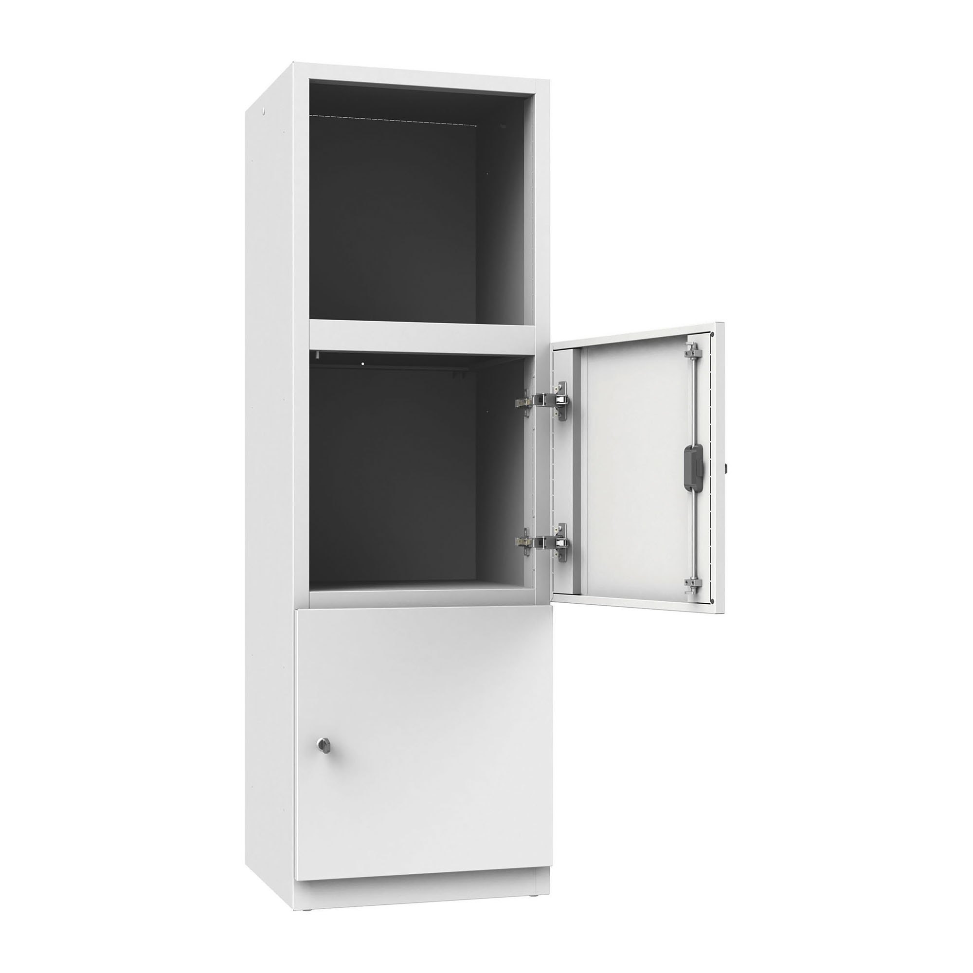 • Ante vano a giorno superiore, vani inferiori ad ante a battente dotate di 2 cerniere interne ammortizzate con rotazione a 135°, canottatura di rinforzo sui