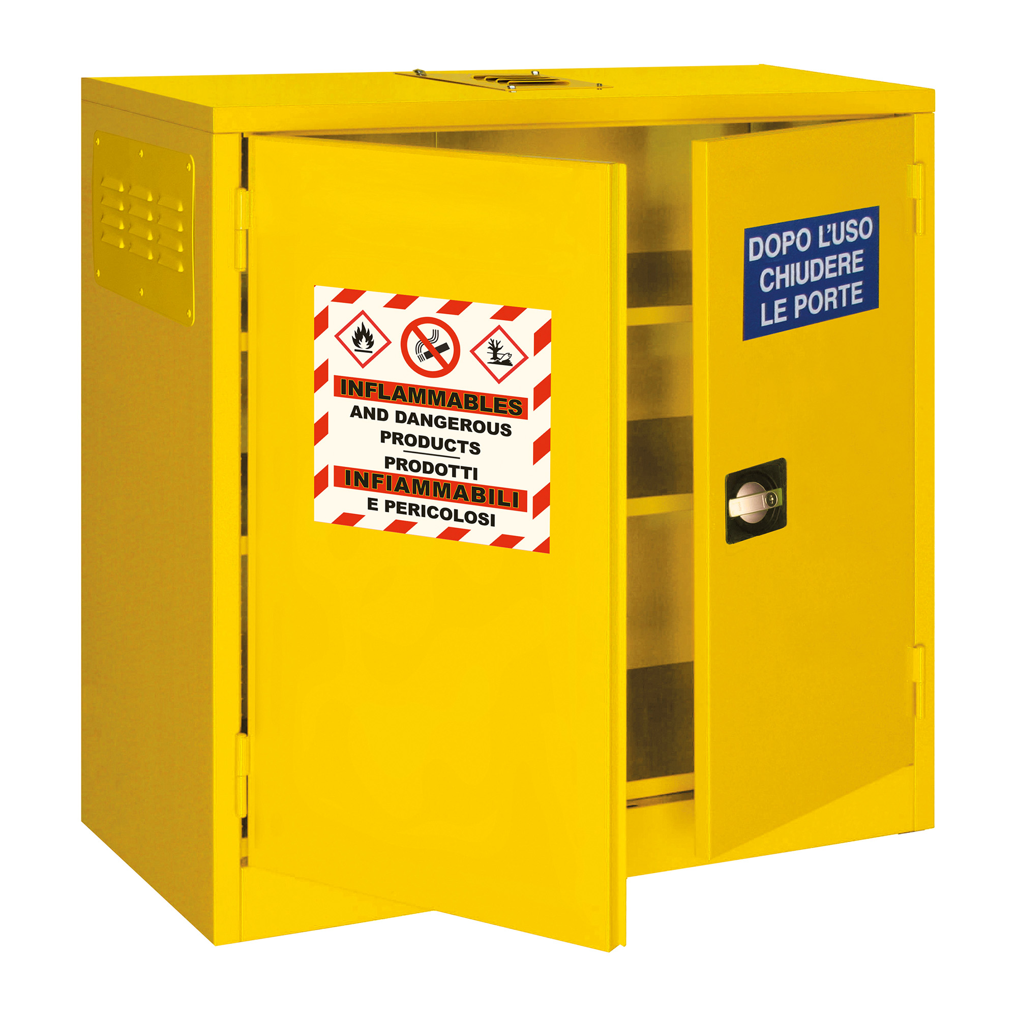 Dotato con ripiani di contenimento regolabili in altezza e vasca di raccolta a tenuta stagna sul fondo con guarnizioni in gomma, n 2 griglie di areazione laterali e una posizionata sul tetto con sistema tagliafiamma appositamente studiate per il ricircolo dell’aria o per l’aspirazione forzata, spigolo arrotondato, robuste cerniere in zama spessore 6 mm, cavo di messa a terra, piedini regolabili, serratura ergonomica in plastica e alluminio con doppia chiave completa di chiusura ad asta con carter copriaste antimanomissione. Costruito a regola d’arte in risposta alle normative vigenti in materia della protezione ambientale e prevenzione di inquinamento.Etichettatura di sicurezza come disposizioni della normativa vigente.