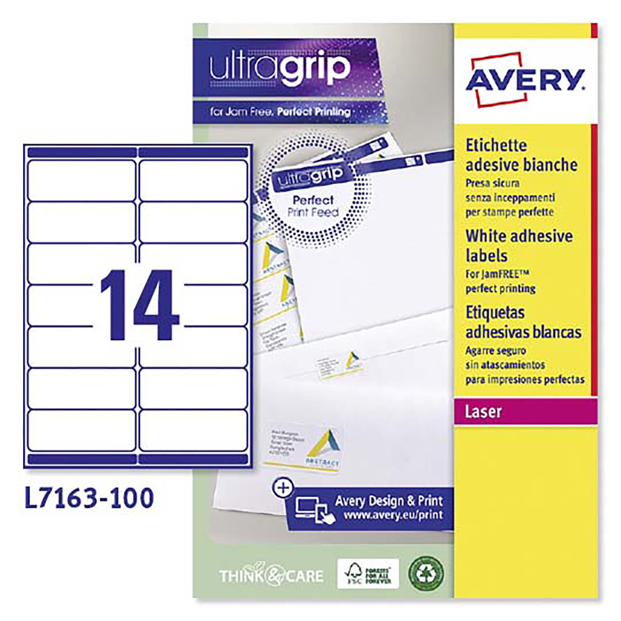 These L7163-100 laser labels by Avery are FSC certified and acid free which makes them environment friendly and a wise choice for your office’s labelling needs. Suitable for colour printers, these labels are resistant to high temperatures that they may be subjected to during laser printing. Save your time and efforts with Avery L7163-100 labels, delivered in a pack of 100 sheets each containing 14 labels.