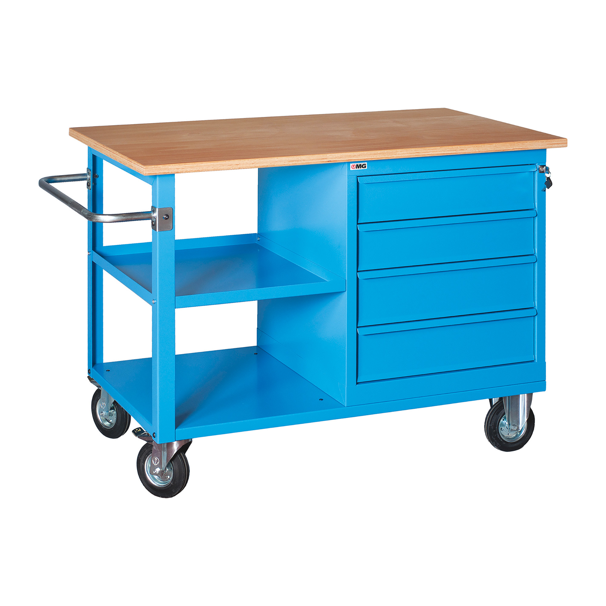 Banco da lavoro monoblocco XLM 120 01 su ruote con 4 cassetti e vano a giorno, 1200 x 700 x 905 mm