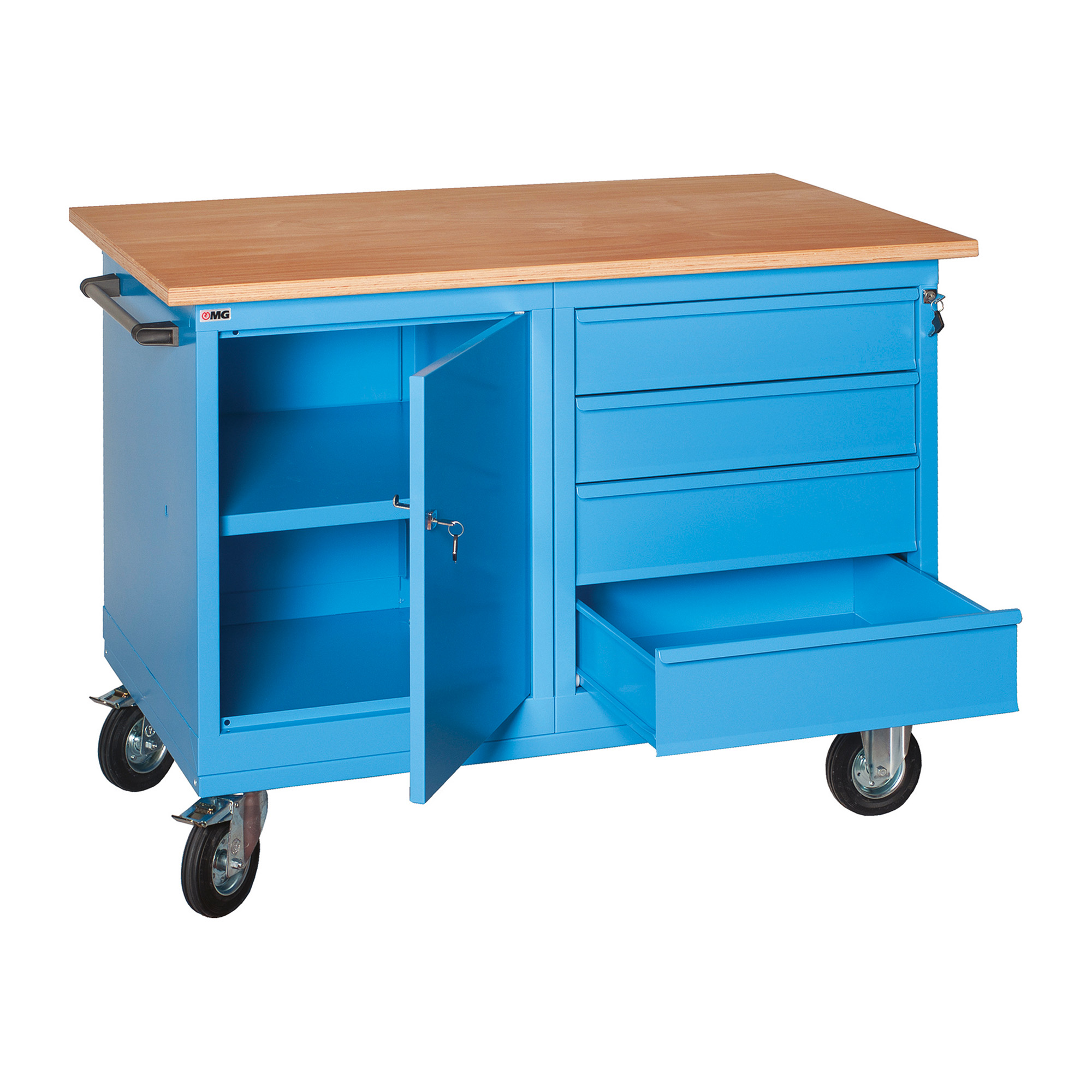 Banco da lavoro monoblocco XLM 120 02 su ruote con 4 cassetti e vano a giorno, 1200 x 700 x 905 mm