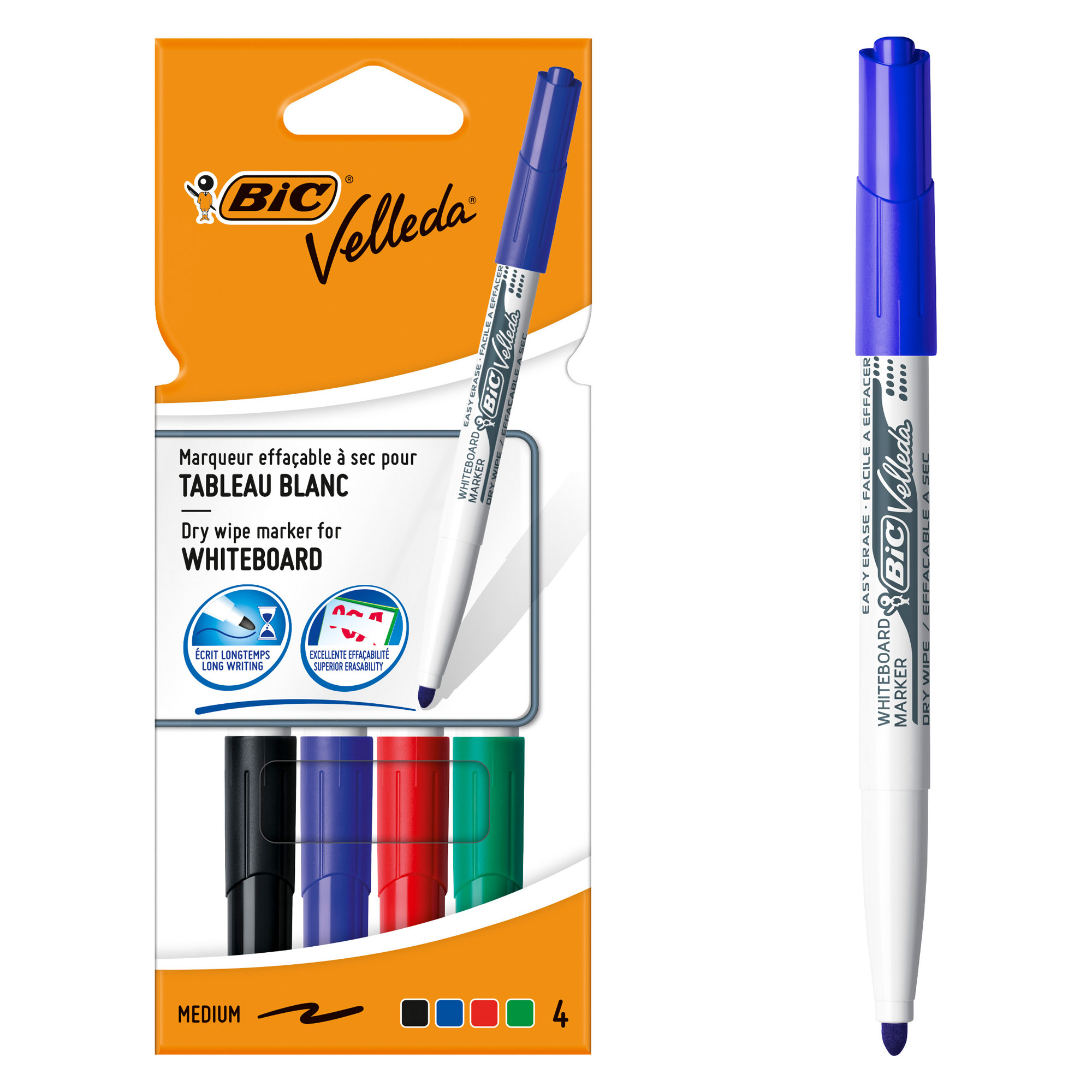 The fixed bullet nib never gets bent out of shape or pushed in while using pressure on whiteboards. The sturdy white barrels of BIC Velleda whiteboard markers perfectly fit the hand and make writing with these very comfortable, while the caps and tops‘ colours match the colour of the ink for easy recognition. This pack of BIC Velleda 1741 whiteboard markers contains 4 pens in assorted colours black, blue, red and green.