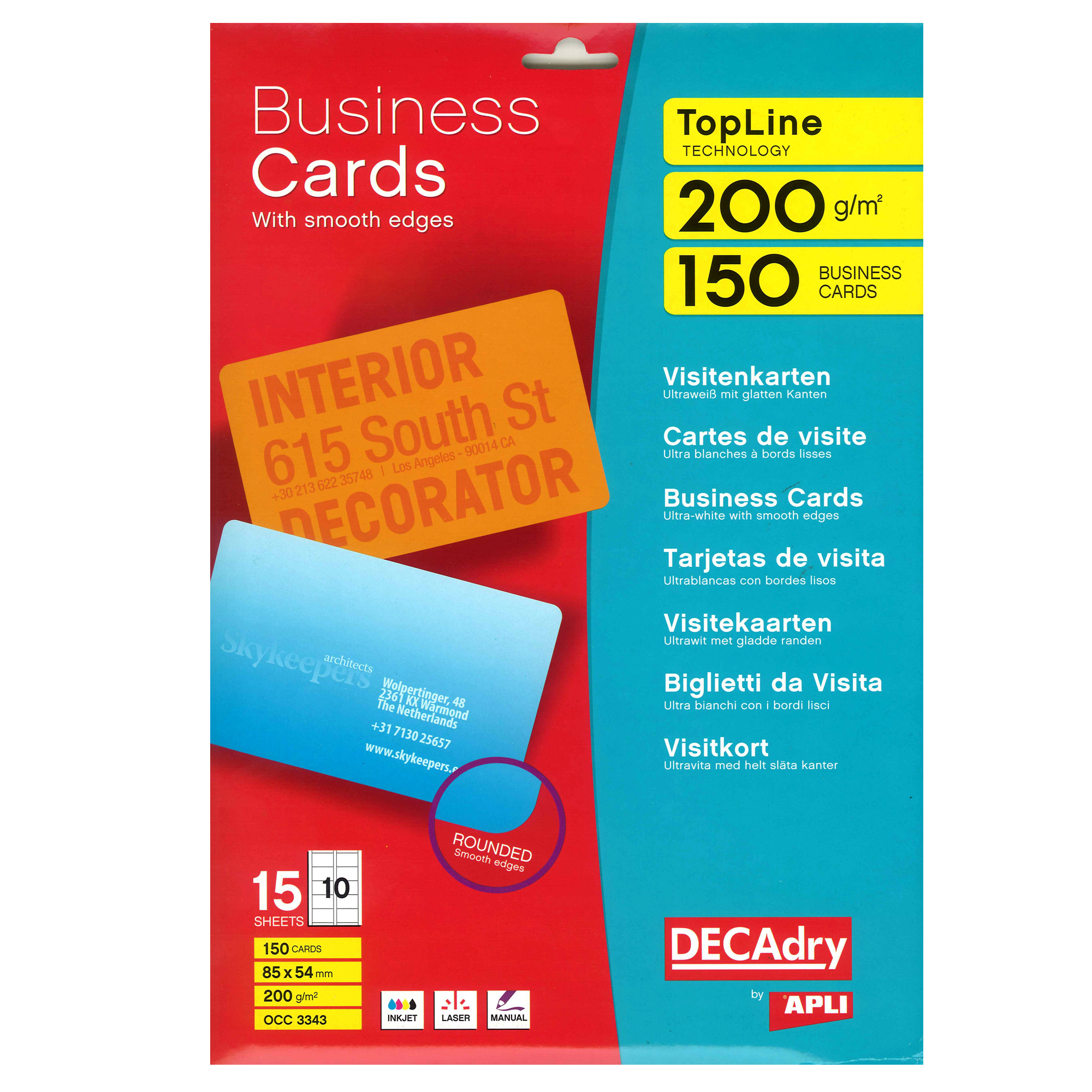 Detailled descriptionTaschetta contenente 15 fogli di cartoncino bianco da 200gr. Ogni foglio contienen 10 biglietti da visita da 85x54mm pretagliati con angoli arrotondati.