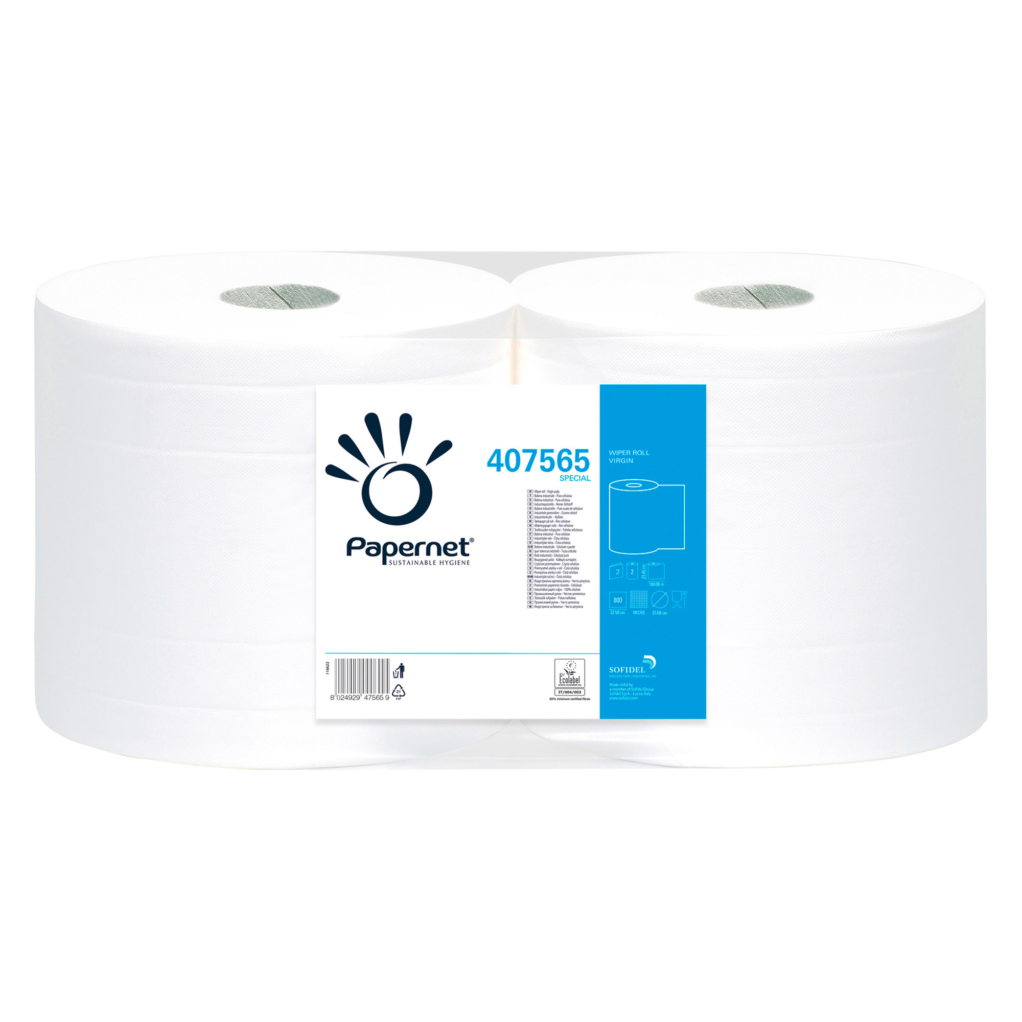 Detailled descriptionLe bobine industriali Papernet, grazie alla grande capacità assobente, sono particolarmente adatte ai luoghi di lavoro che richiedono una pulizia accurata e quotidiana.Idonee al contatto con alimentiCertificate EcolabelIn pura cellulosa bianca microgoffrata a 2 veli.Confezione da 2 rotoli da 800 strappi.
