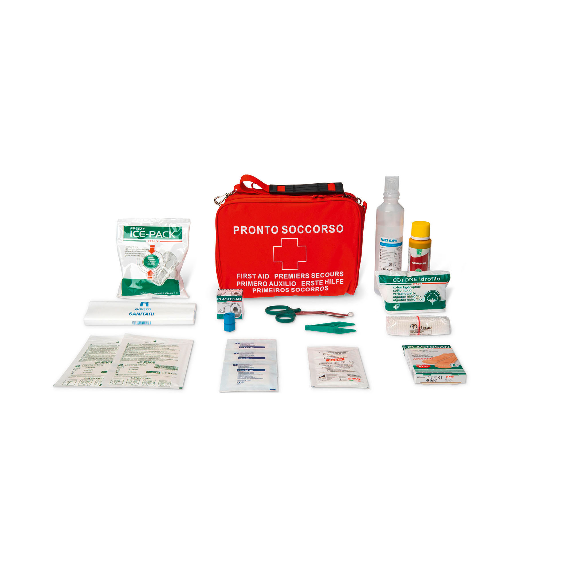 Borsa in nylon, imbottita, colore rosso con maniglia e tracolla, chiusura con cerniera, stampa in bianco “pronto soccorso” in 6 lingue.
