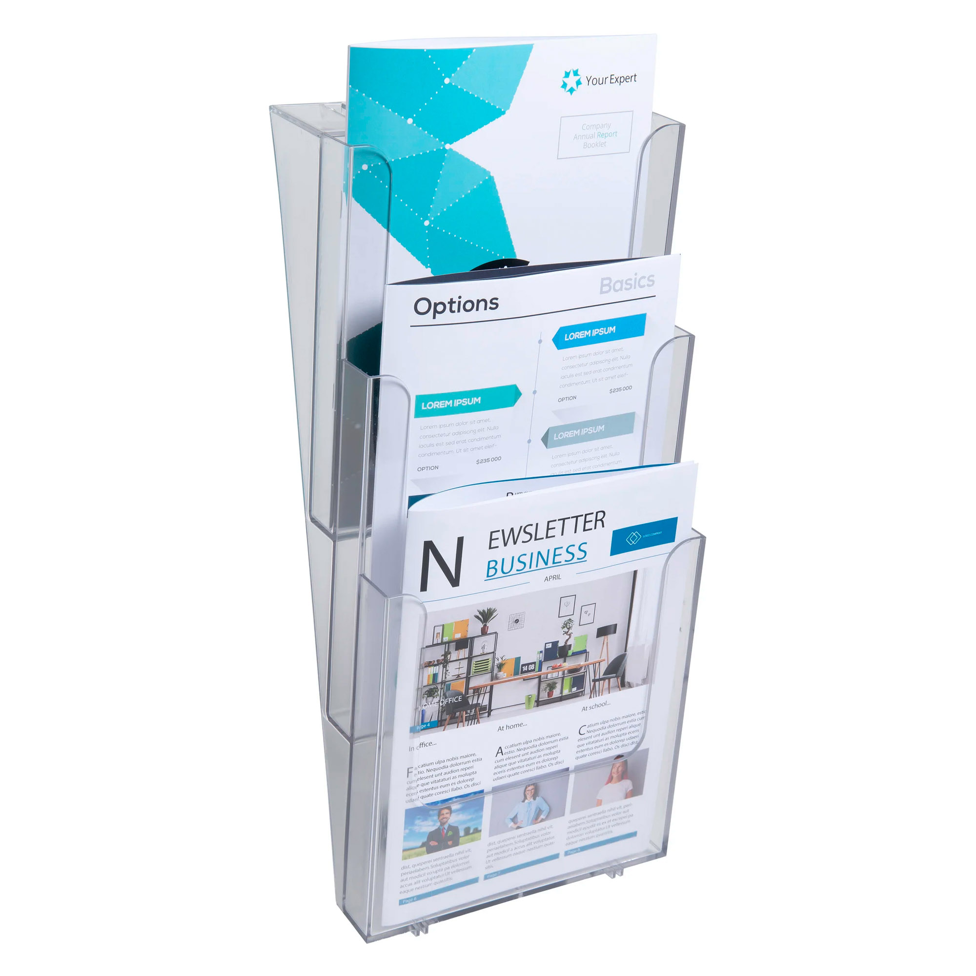 Consente di risparmiare spazio prezioso sulla scrivania e sul tavolo della reception. Ideale per esporre materiale informativo in reception, sale d'attesa, in occasione di fiere o in ufficio