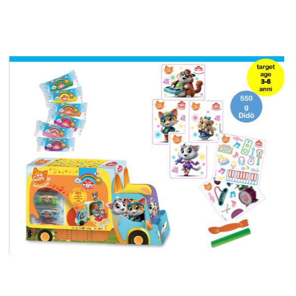 Detailled descriptionContenuto: 5 salsicciotti 50g, 3 barattoli 100g, 2 formine doppie con i 4 Bu?ycats, 1 cartoncino con strumenti musicali, 1 cartoncino con sticker decorativi, 1 coltellino e 1 mattarello, 4 ruote e 2 assali.
