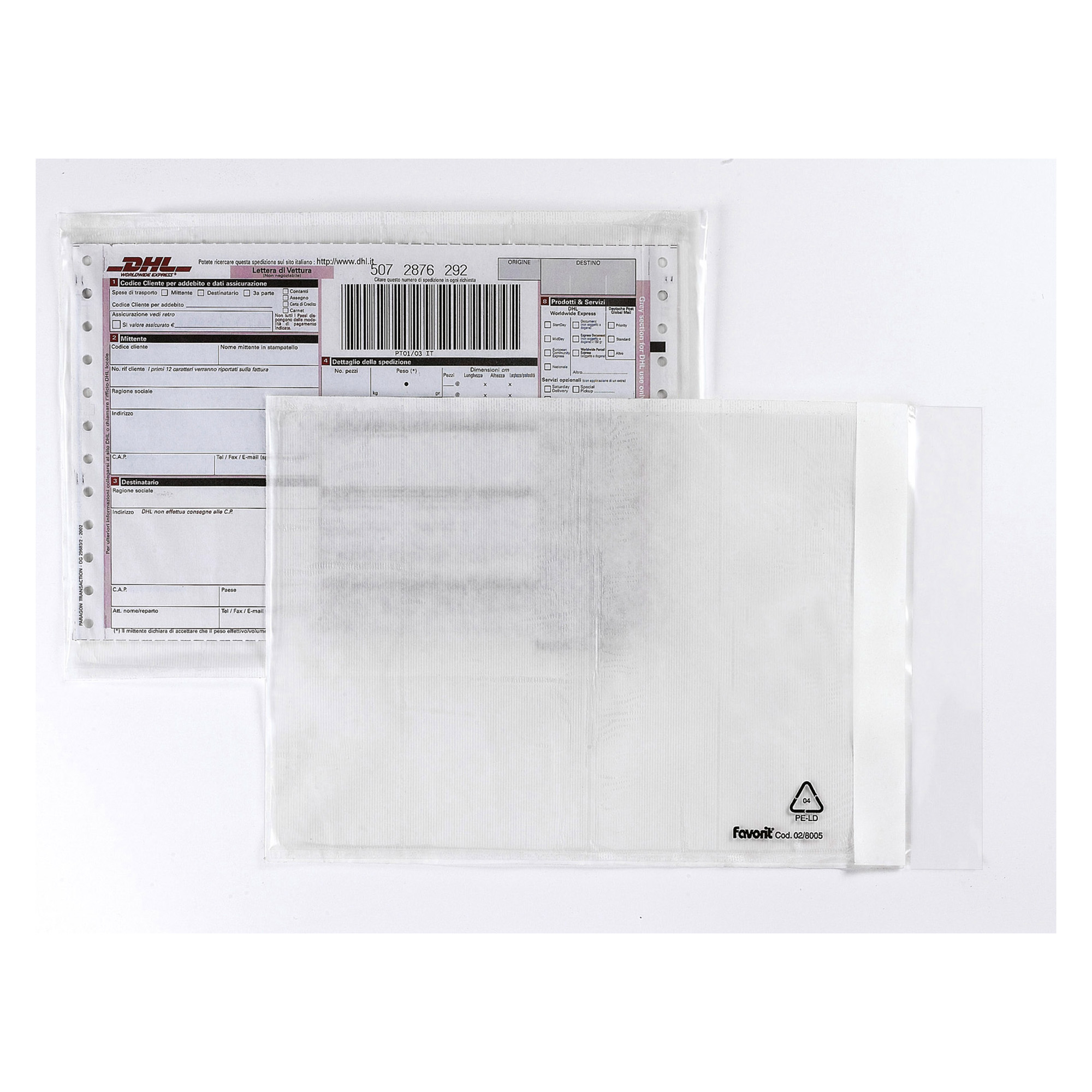 Buste trasparenti in polietilene a bassa densità. Adesivo multi-superficie nella parte posteriore. Inserimento laterale con speciale chiusura che evita fuoriuscita dei documenti.