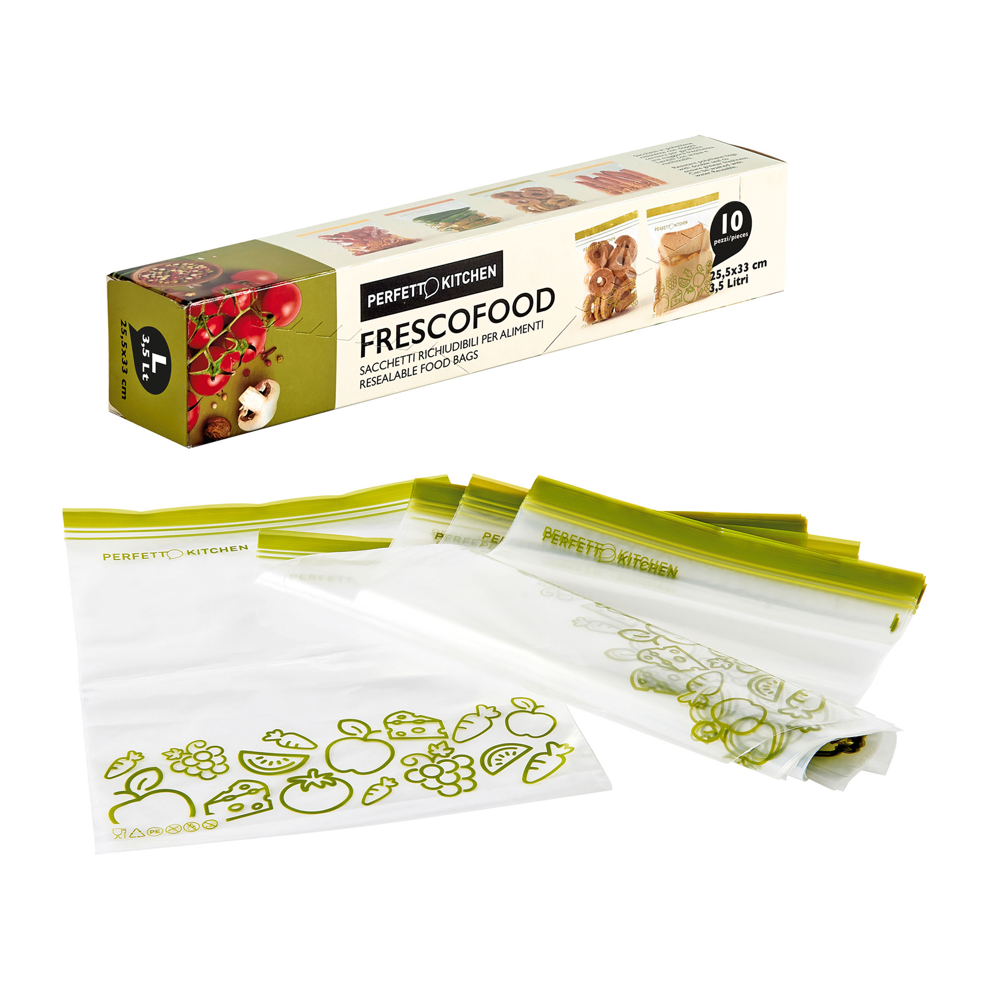 Sacchetti richiudibili per alimenti. Materiale in polietilene con doppia cerniera per garantire una maggior freschezza. Sono adatti per frigorifero e Freezer oppure in dispensa per alimenti secchi. Perfetti anche per contenere liquidi. Lavabili e riutilizzabili.