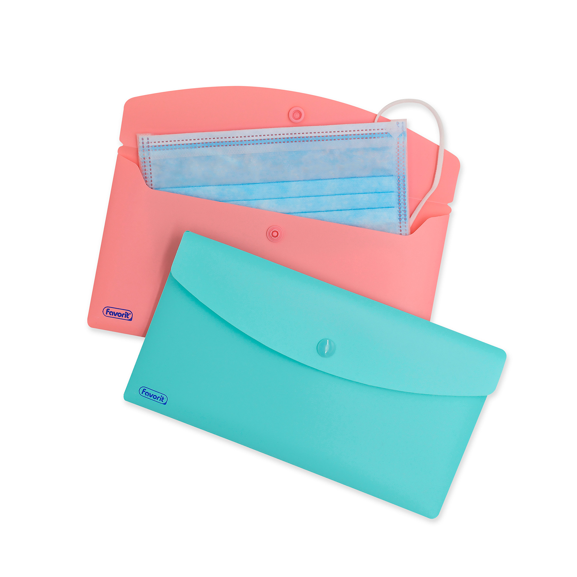Buste con bottone realizzate in polipropilene opaco ad elevato spessore nei colori pastello.