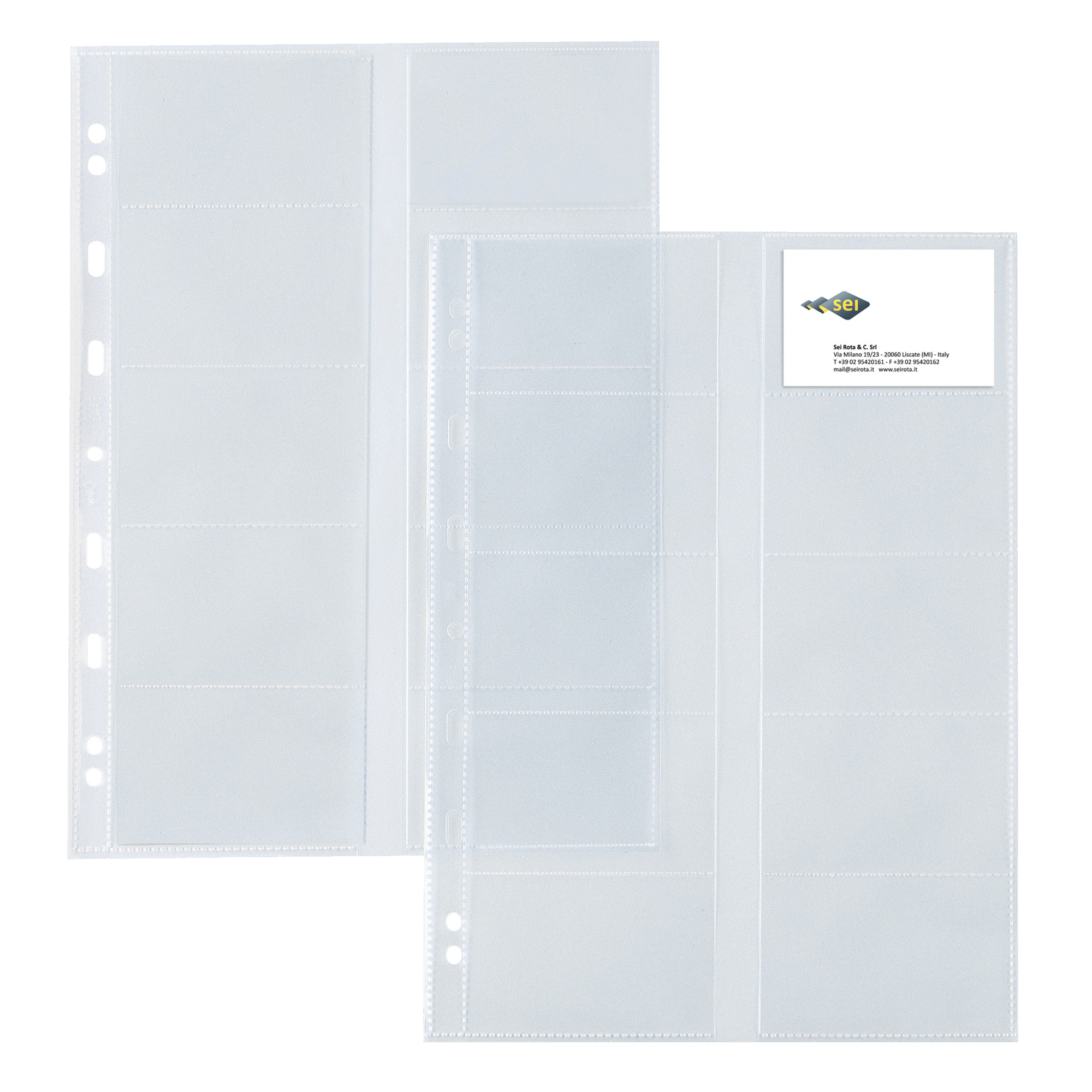 Detailled descriptionTelephone and business cards holder pockets with universal hole-punched made of smooth texture PP. Provided with 10 compartments for holding business and telephone cards.