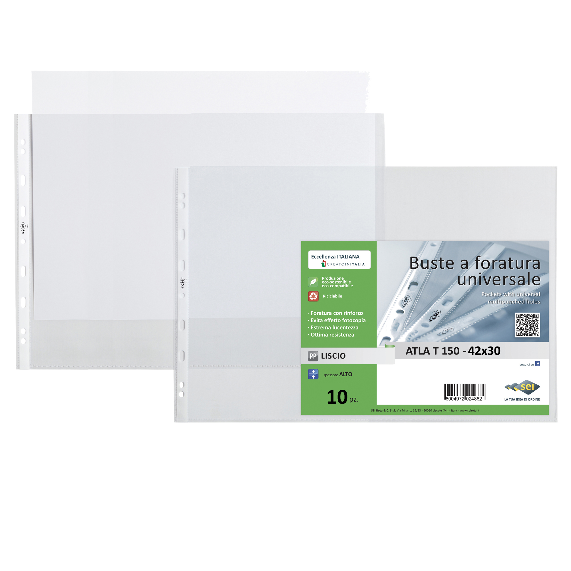Detailled descriptionBuste forate in PP trasparente liscio con medio spessore. Foratura universale rinforzata sul lato corto. Ideali per archiviare qualsiasi tipo di documento. Formato 42x30cm. Con apertura a d'album.