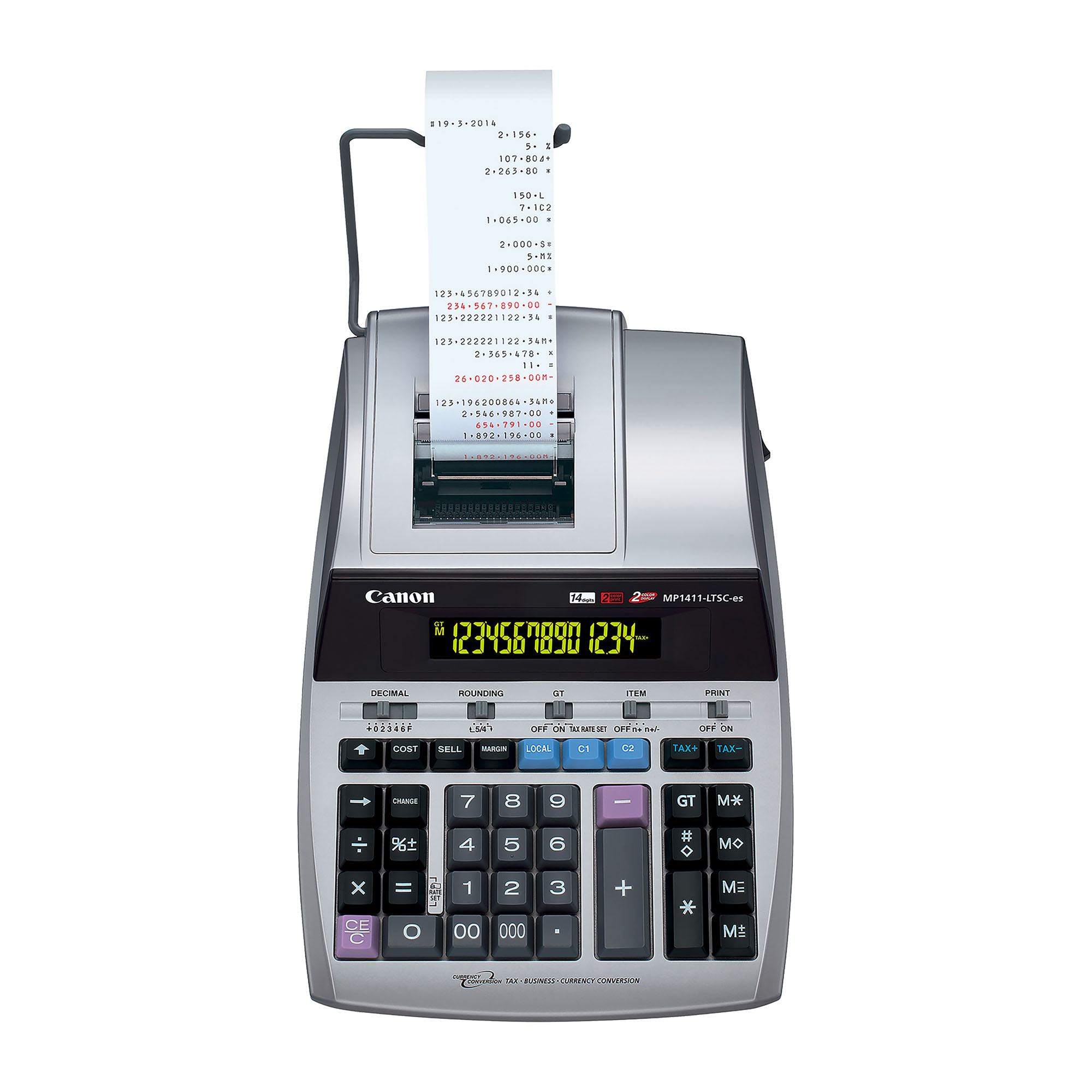 Calcolatrice a 14 cifre con sistema di stampa a 2 colori e funzioni di calcolo tasse, calcolo aziendale e conversione valuta.