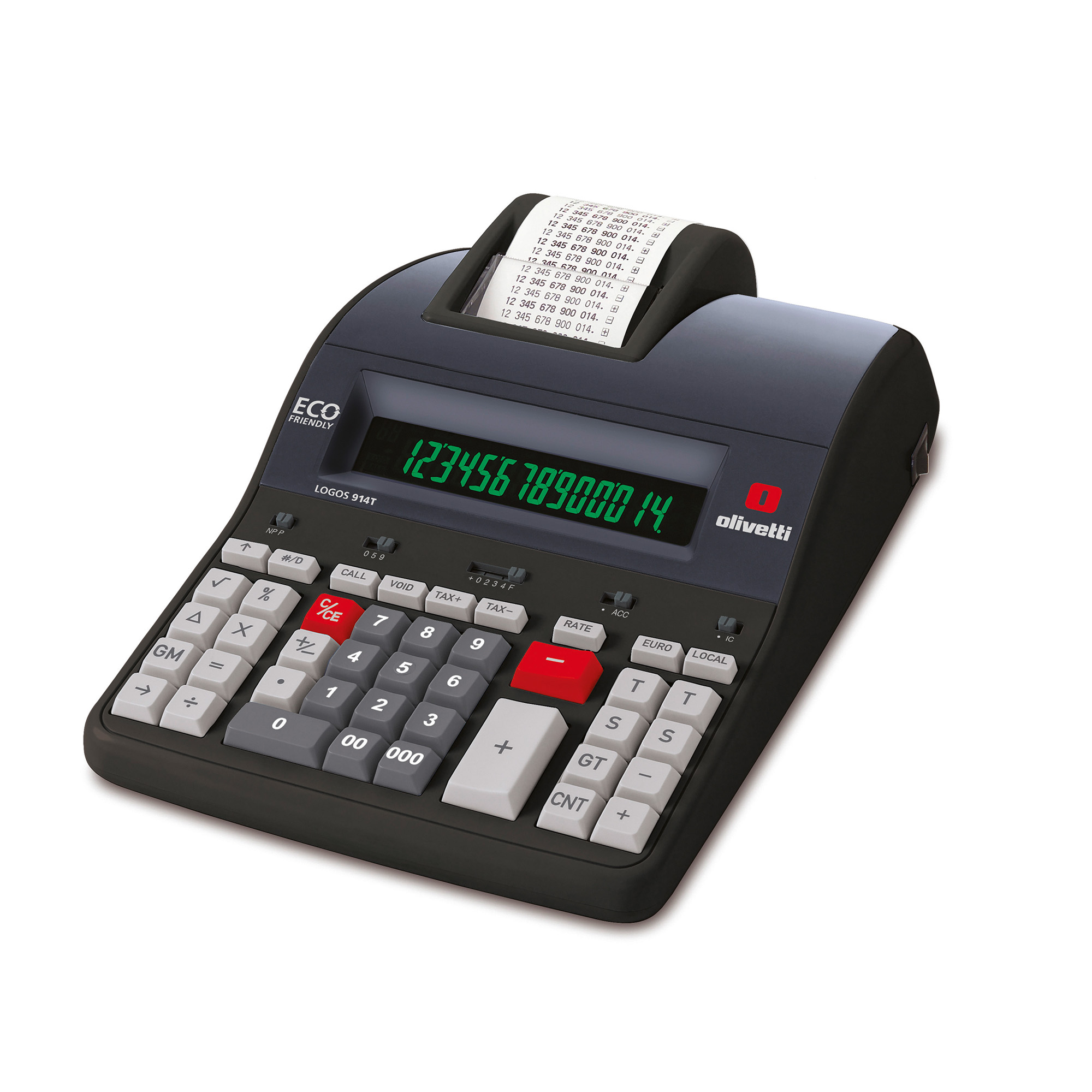 Calcolatrice stampante termica Logos 914T della Olivetti con molteplici funzioni e un display LCD con 14 cifre e 2 colori.