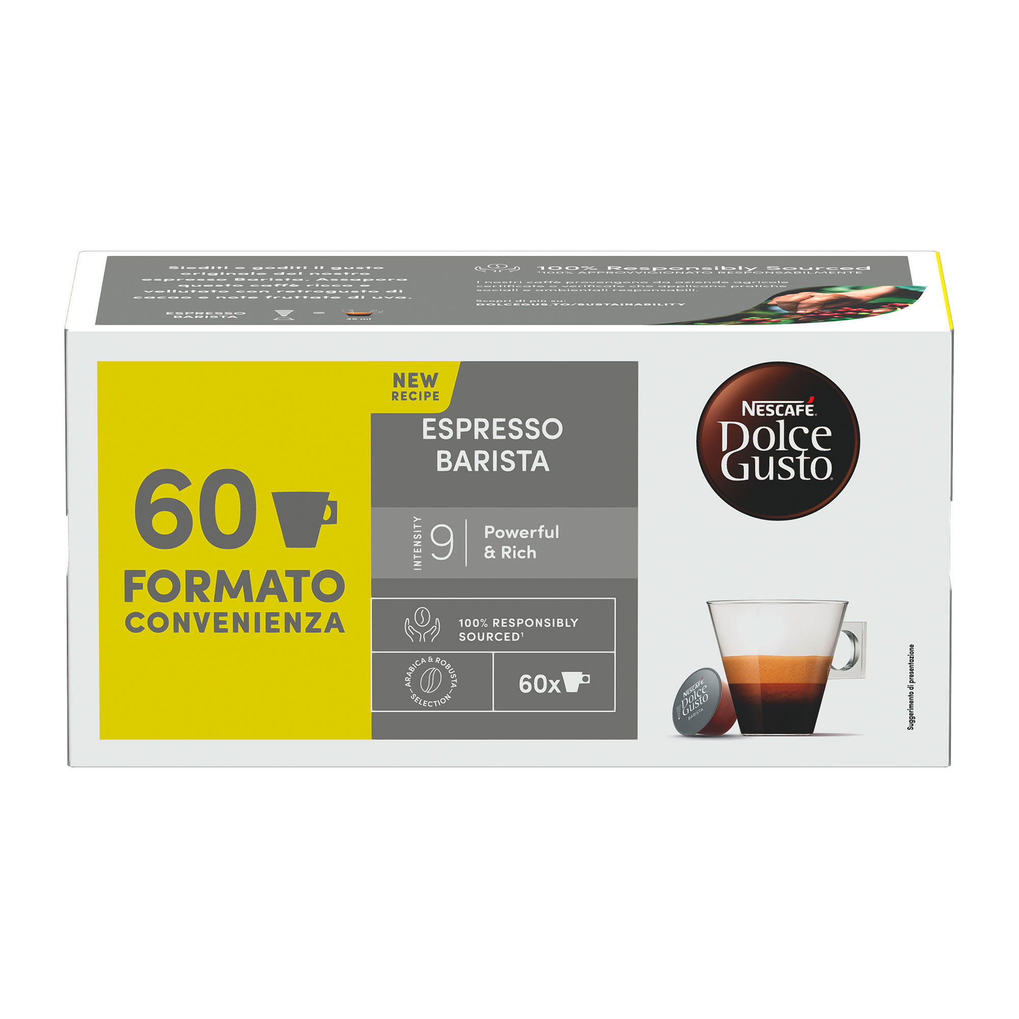 Detailled descriptionCaffè Nestlè Dolce Gusto Barista in formato convenienza da 60 capsuleCaffè Selezione Arabica e RobustaPowerful & RichIntensità 9