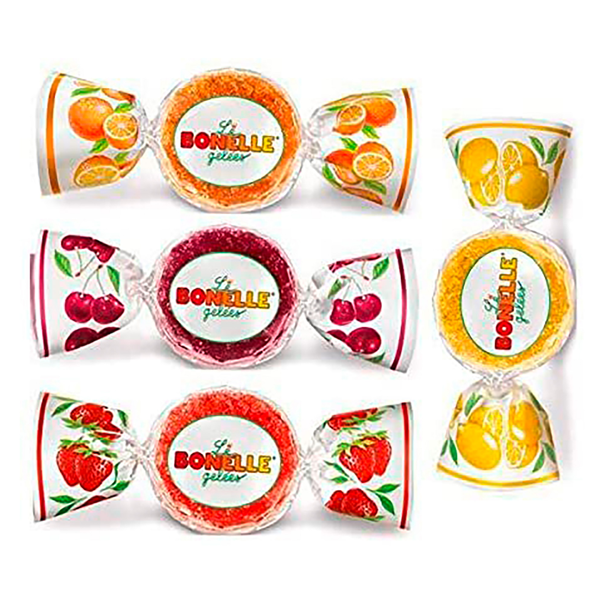 Detailled descriptionEnjoy the taste of Italy. Tempting and delicious. Bonelle Gelee sweets are bursting with flavours of Orange, Lemon, Strawberry and Cherry Produced in Italy with only the finest ingredients and no artificial colours and only natural flavours.