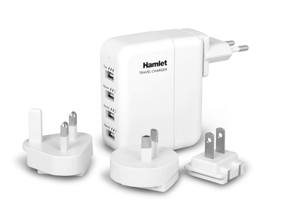 Hamlet Travel Charger is a compact 20W USB wall charger that can recharge up to 4 electronic devices simultaneously and be used in more than 150 countries thanks to its 4 interchangeable plugs. Equipped with 4 USB ports including 1 x 2400mA and 3 x 1000mA, it is ideal for charging mobile devices such as smartphones, tablet PCs, mobile phones, MP3 players, digital cameras and so on. 2400mA port is particularly suitable for charging tablets and smartphones with high power demand while the 3 1000mA ports are ideal for recharging small devices like mobile phones and MP3 players.