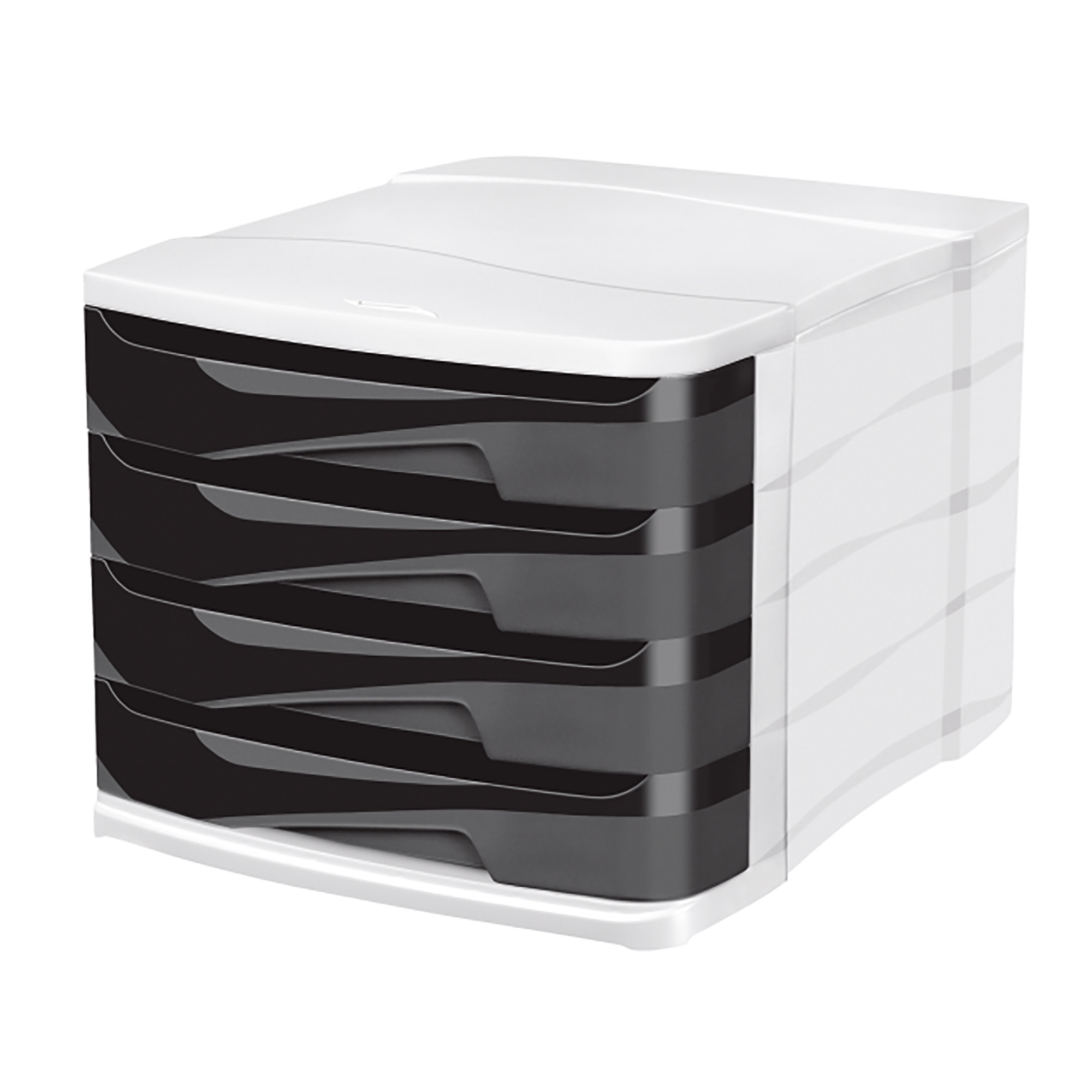CEP drawer box. Made of 90% recycled polystyrene and is fully recyclable. According to the ISO 14021 standard. Good looking box with a matte glossy finish. Stable due to the non-skid rubber feet. Number of drawers: 4 drawers. Dimensions (L x W x H): 29 x 38.6 x 24.6 cm.