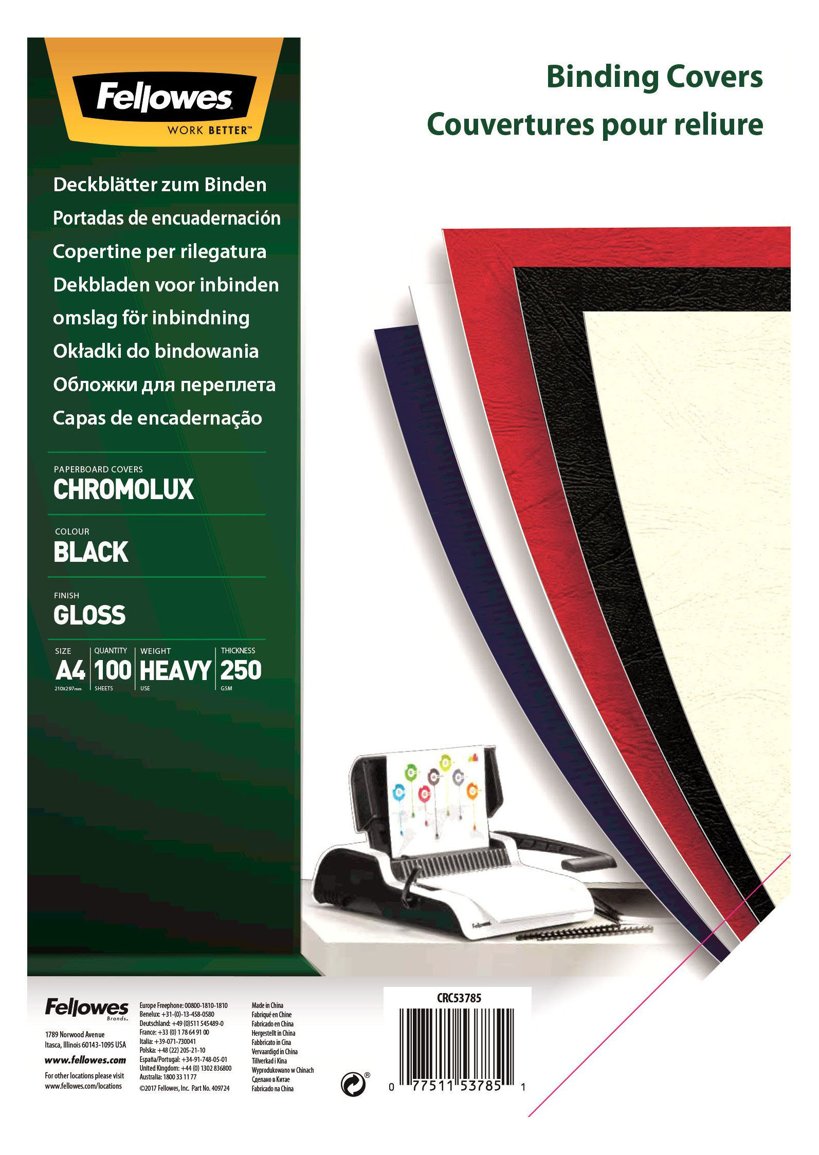 Detailled descriptionCopertine formato A4 con finitura lucida da utilizzare anche con copertine trasparenti per creare un effetto lucidoCartoncino pesante 250 gsm 100% riciclabilePer uso con tutte le rilegatrici a dorso metallico e plastico. Colore nero