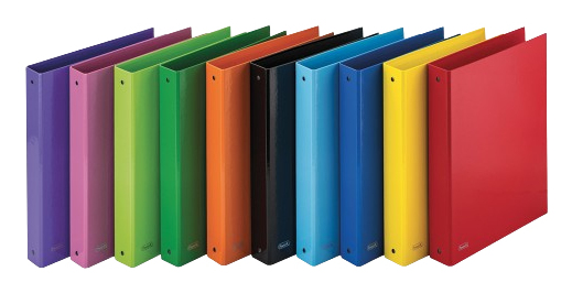 Made of cardboard, covered in printed paper and glossy laminated exterior. 10 brilliant colours with matching interior. A must-have for modern and elegant filing at home, school and office. Internal size: 22×30 cm. 4 round rings mechanism, 30 mm diameter.