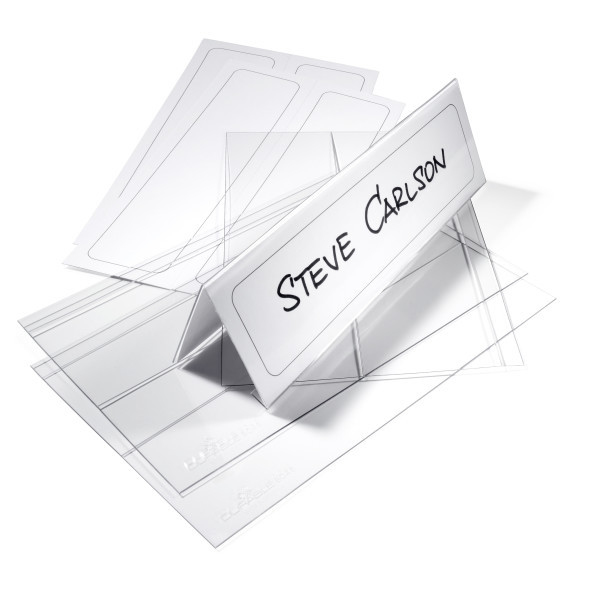 Detailled descriptionFlat packed, pre-scored PET table place name holders. Easily folded into shape. Size: 61/122 x 210 mm (HxW) 10 per bag