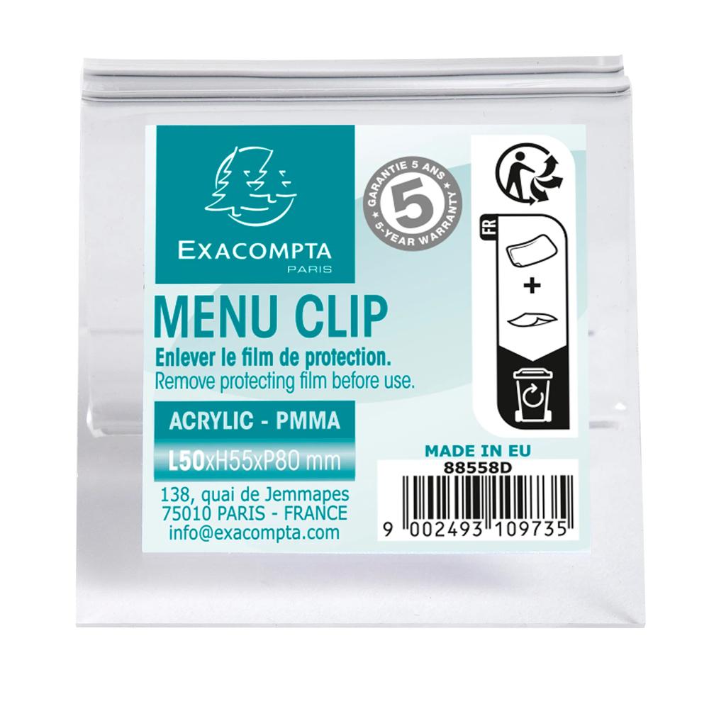 Card holder clip L50mm The 50mm wide Exacompta card holder clip holds menus, signs etc. It can be placed on tables, counters, desks or shelves. Made of high quality acrylic (PMMA) with very high transparency. This sign holder, made in Europe is UV resistant, so will not yellow 5 year guarantee. You can easily create your personalised signs in the right size with KREAMAN on www.exacompta.com