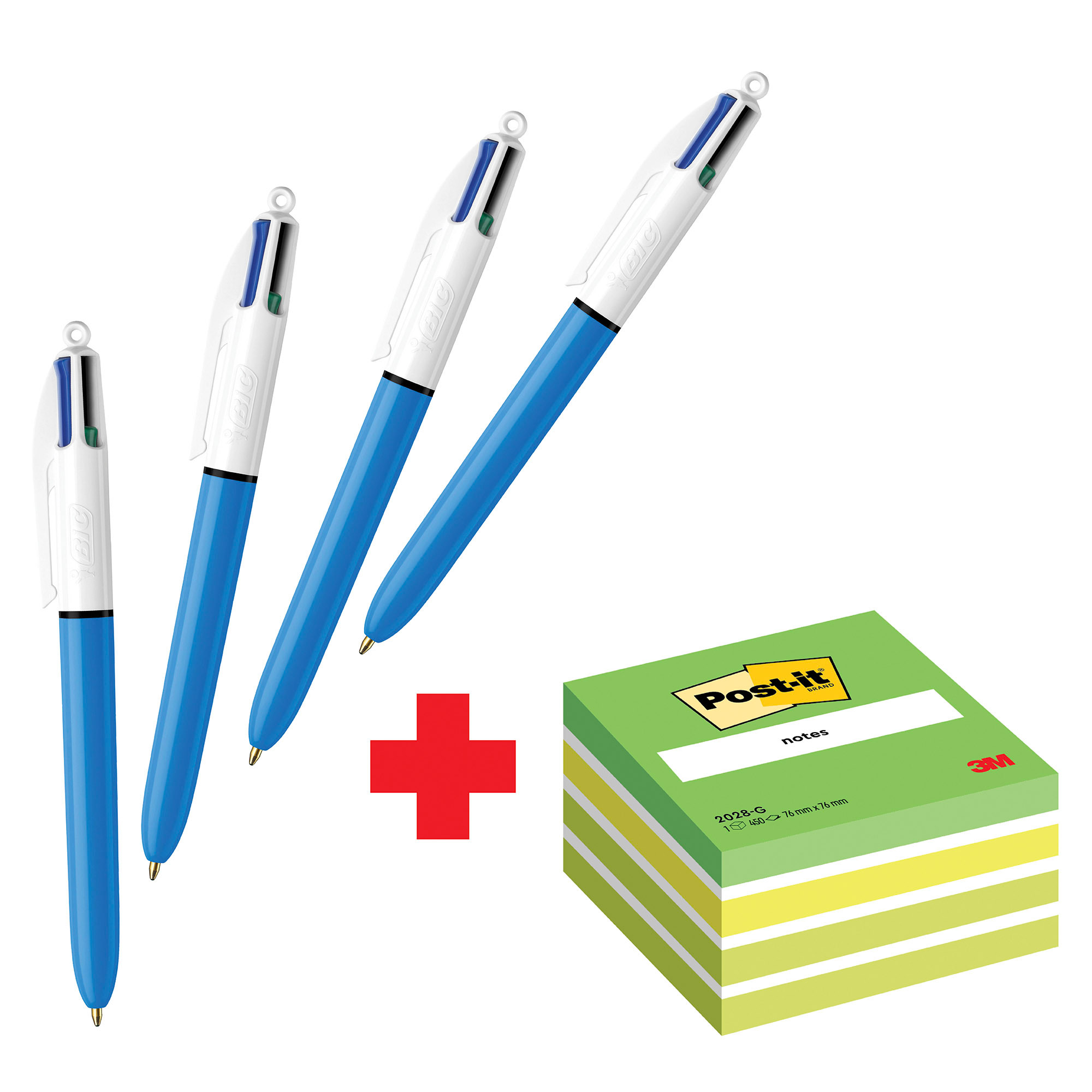 Detailled descriptionPenna BIC 4 Colori Original: 4 colori in un’unica penna: Nero, Blu, Rosso e VerdeCubo Post it: contiene 450 foglietti riposizionabili con adesivo standard formato 76 x 76 mm
