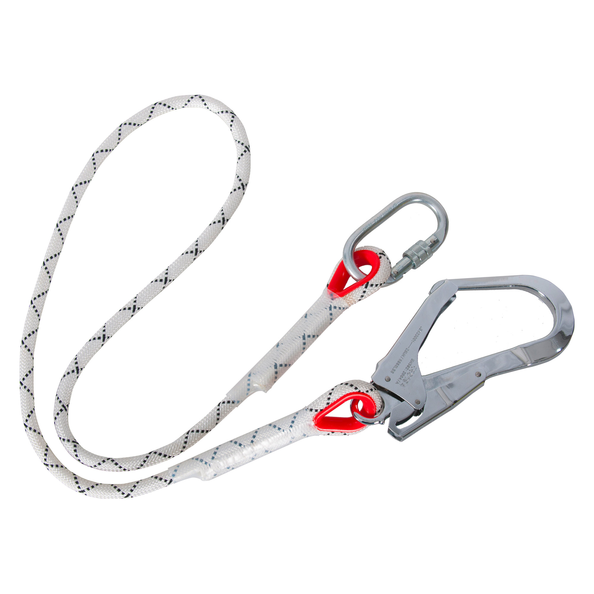 Sviluppato per una protezione continua durante il lavoro in quota, questo resistente cordino con guaina da 150 centimetri ha un gancio per impalcatura e un moschettone.