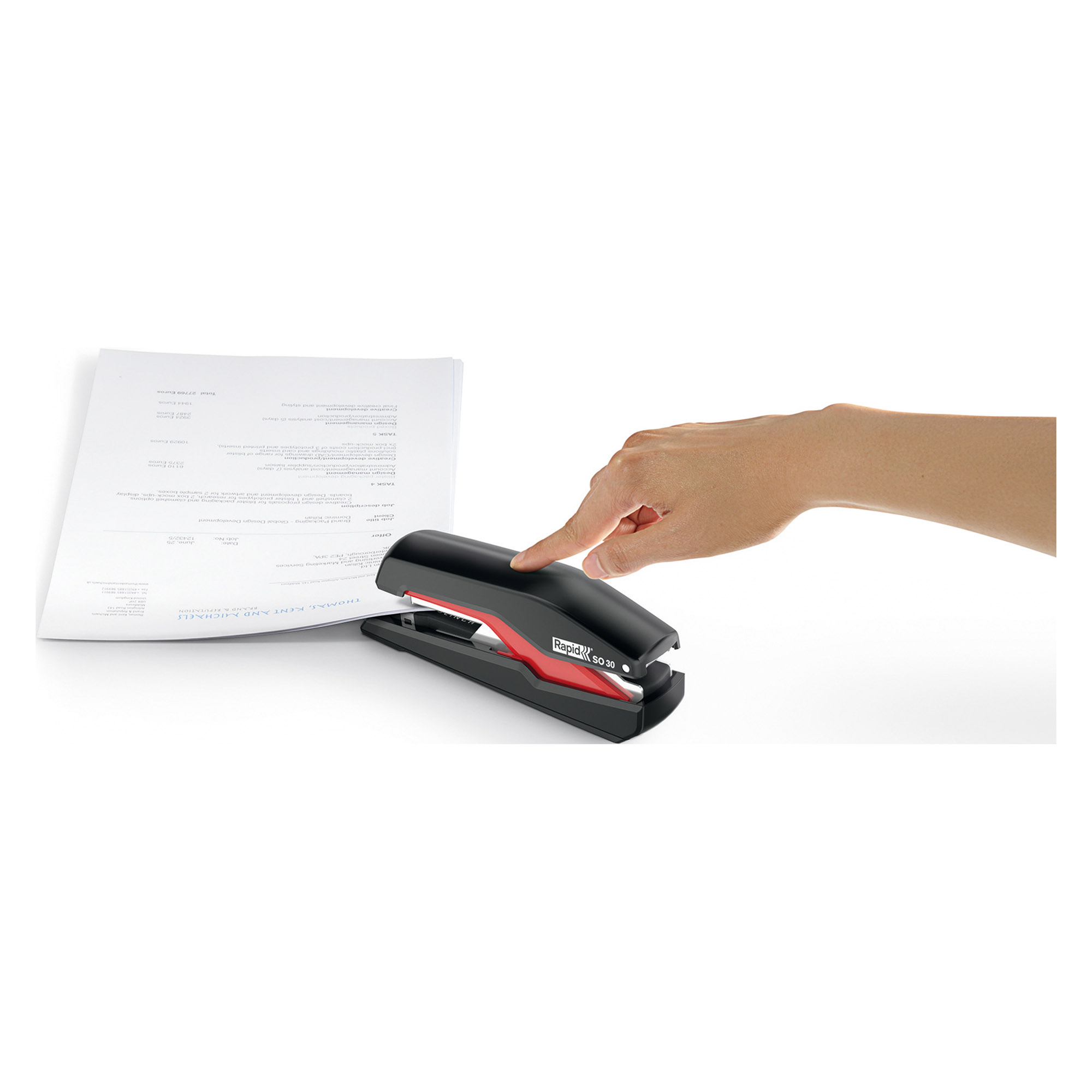 This Rapid SO60 Full Strip 60 Sheet capacity stapler in black and red with patented superFlatClinch technology flattens the staple to give up to 40% slimmer paper stacks.