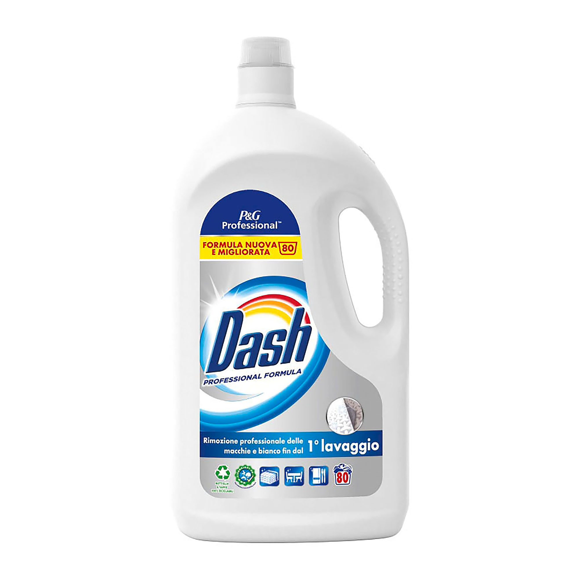 Detersivo liquido lavatrice per uso professionale flacone da 80 misurini. Risultati professionali, bianchi brillanti già a 30C. Dona bianco impeccabile e pulizia profonda ai tessuti lasciandoli gradevolmente profumati. Bottiglia e tappo in plastica 100% riciclabili.
