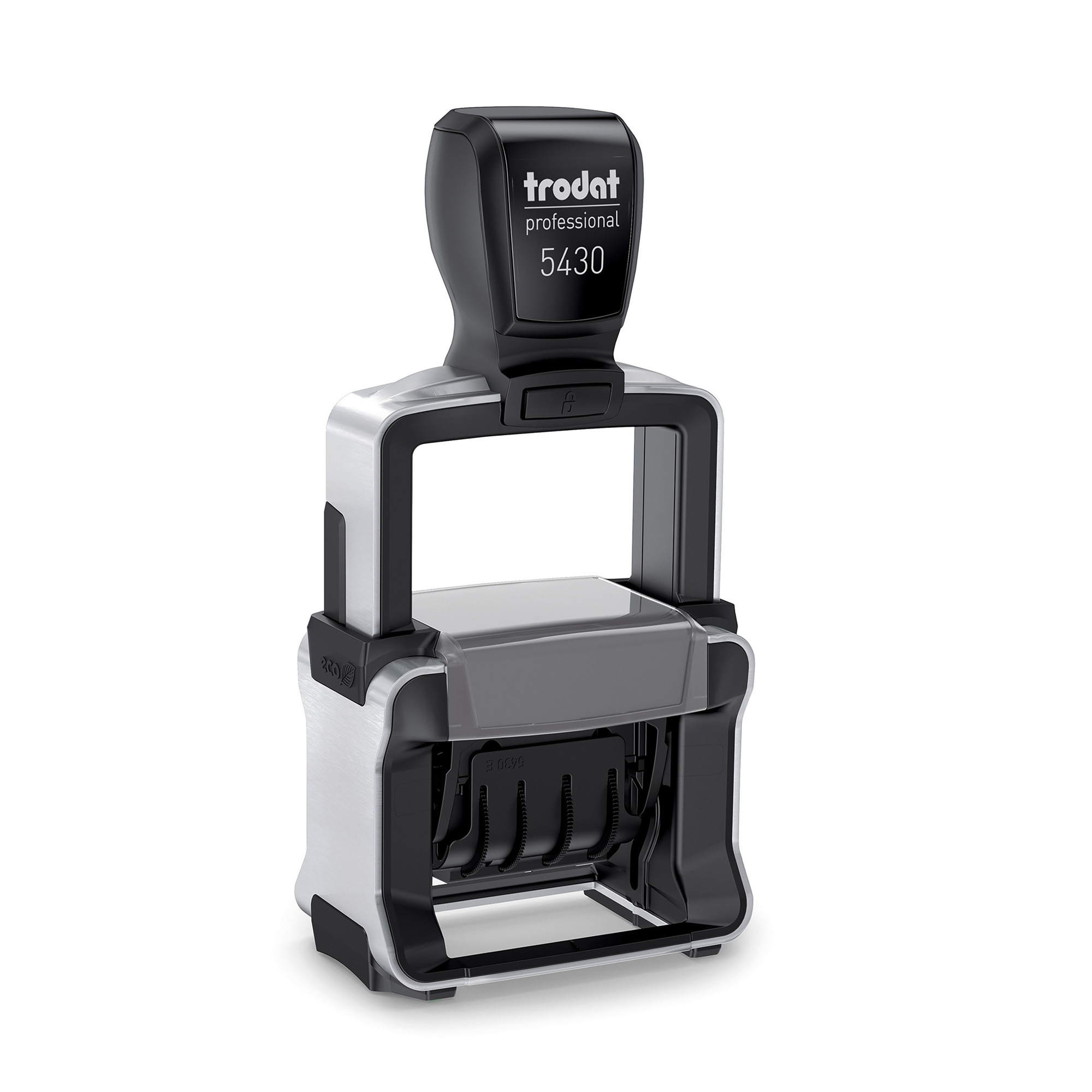 Timbro datario autoinchiostrante per uso professionale con 3 testi commerciali intercambiabili: RICEVUTO, PAGATO, REGISTRATO.
