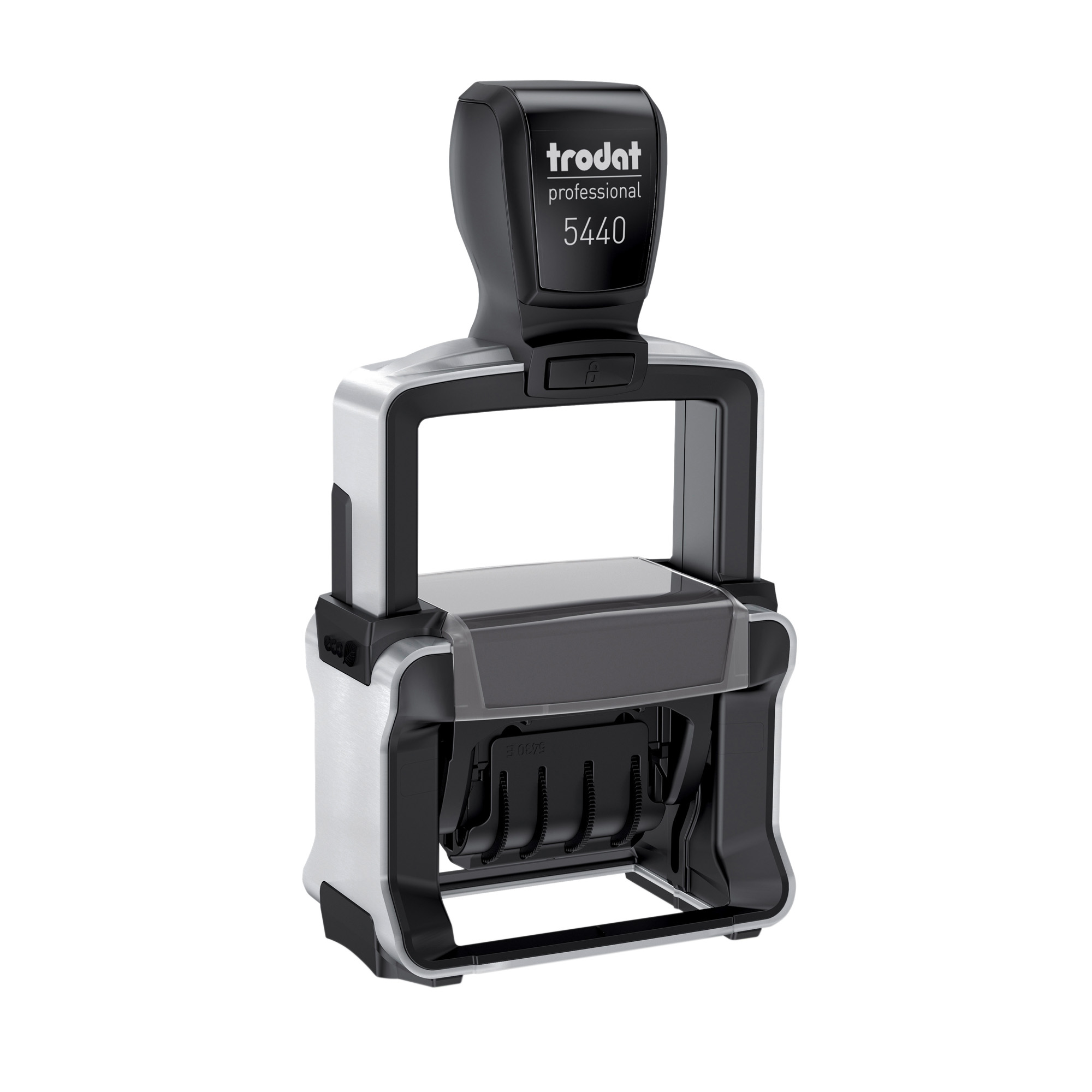 Timbro datario autoinchiostrante personalizzabile con testo e logo per uso professionale.