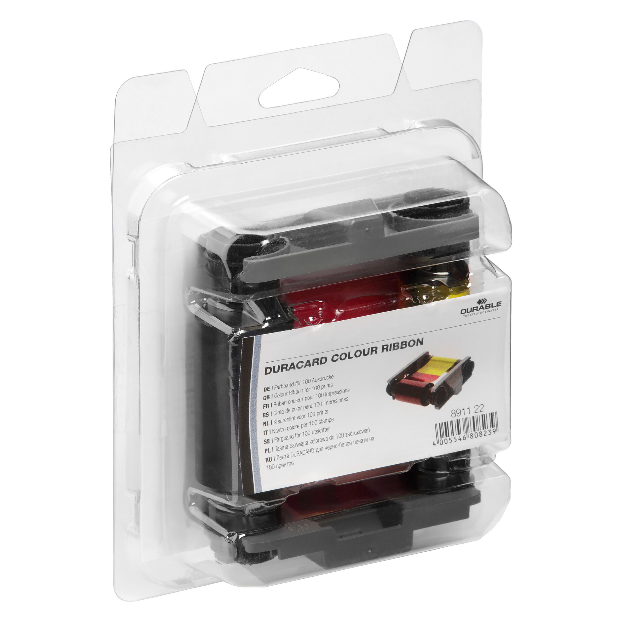 The Durable thermal printer prints single-sided printing on PVC cards in format 53,98 x 85,60 mm.