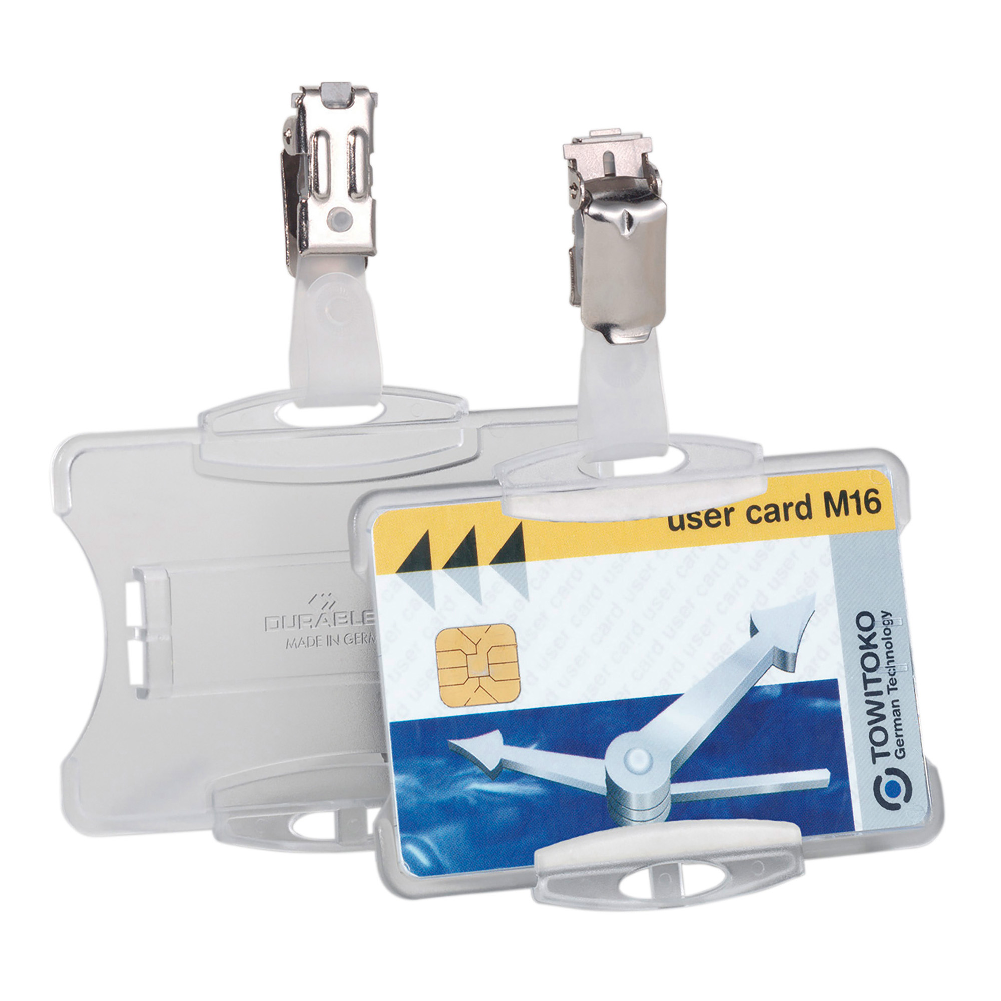 Durable business card hard case 8118. With clip. Case for ID and security card. Useable in landscape or portrait format. Made of high quality polystyrene. Overall protection for the card and it’s magnetic strip. For 1 card. Dimensions: 54 x 85 mm. Quantity: 25.
