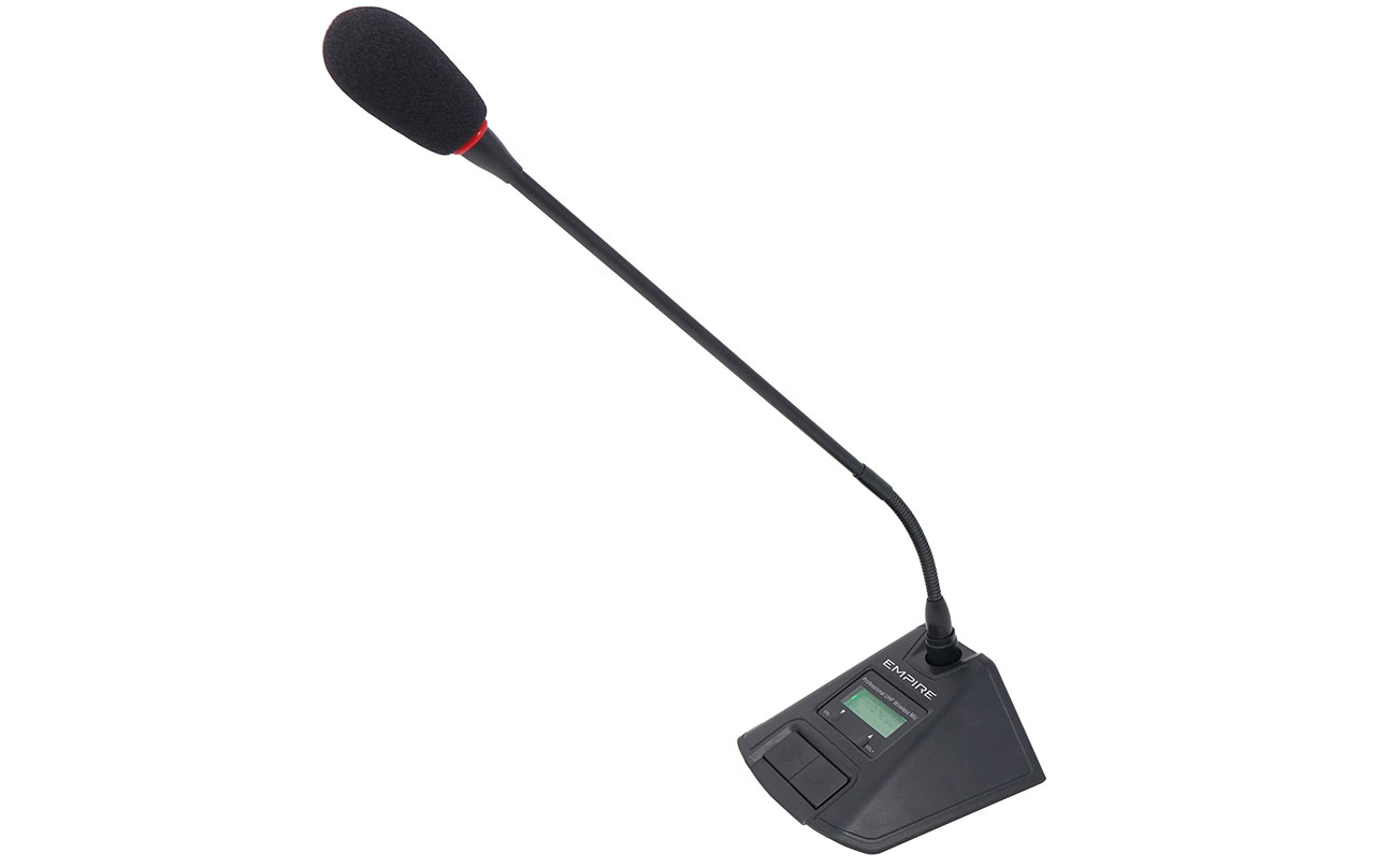 Empire Media MD100. Microphone type: Table microphone, Microphone connectivity: RF Wireless, Microphone frequency response: 30 - 18000 Hz. Receivers AF frequency response: 30000 - 18000 Hz. Transmitter type: Built-in transmitter. Radio Frequency (RF) range: 640 - 699 MHz, Operating frequency type: Ultra High Frequency (UHF), Switching bandwidth: 60 MHz. Battery life (max): 7 h, Battery technology: Alkaline, Battery type: AA