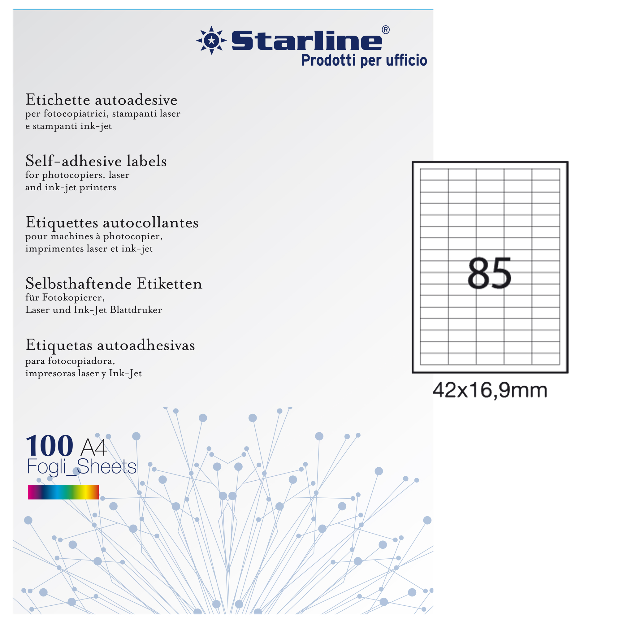 Etichette adesive bianche STARLINE utilizzabili con stampanti laser, inkjet o fotocopiatori. Adesivo permanente. Dotate di margine di sicurezza lungo tutto il perimetro. In scatola da 100 fogli formato A4.
