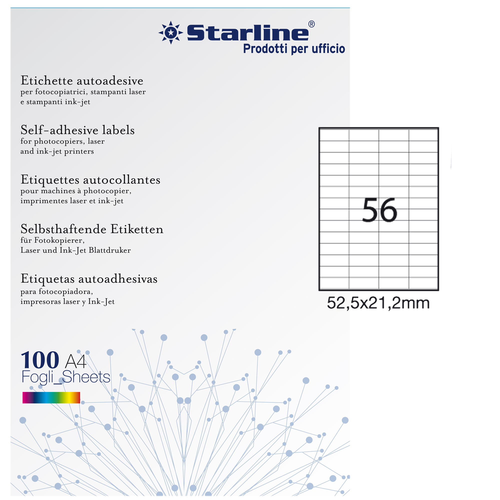 Etichette adesive bianche STARLINE utilizzabili con stampanti laser, inkjet o fotocopiatori. Adesivo permanente. Prive di margne di sicurezza lungo il perimetro. In scatola da 100 fogli formato A4.