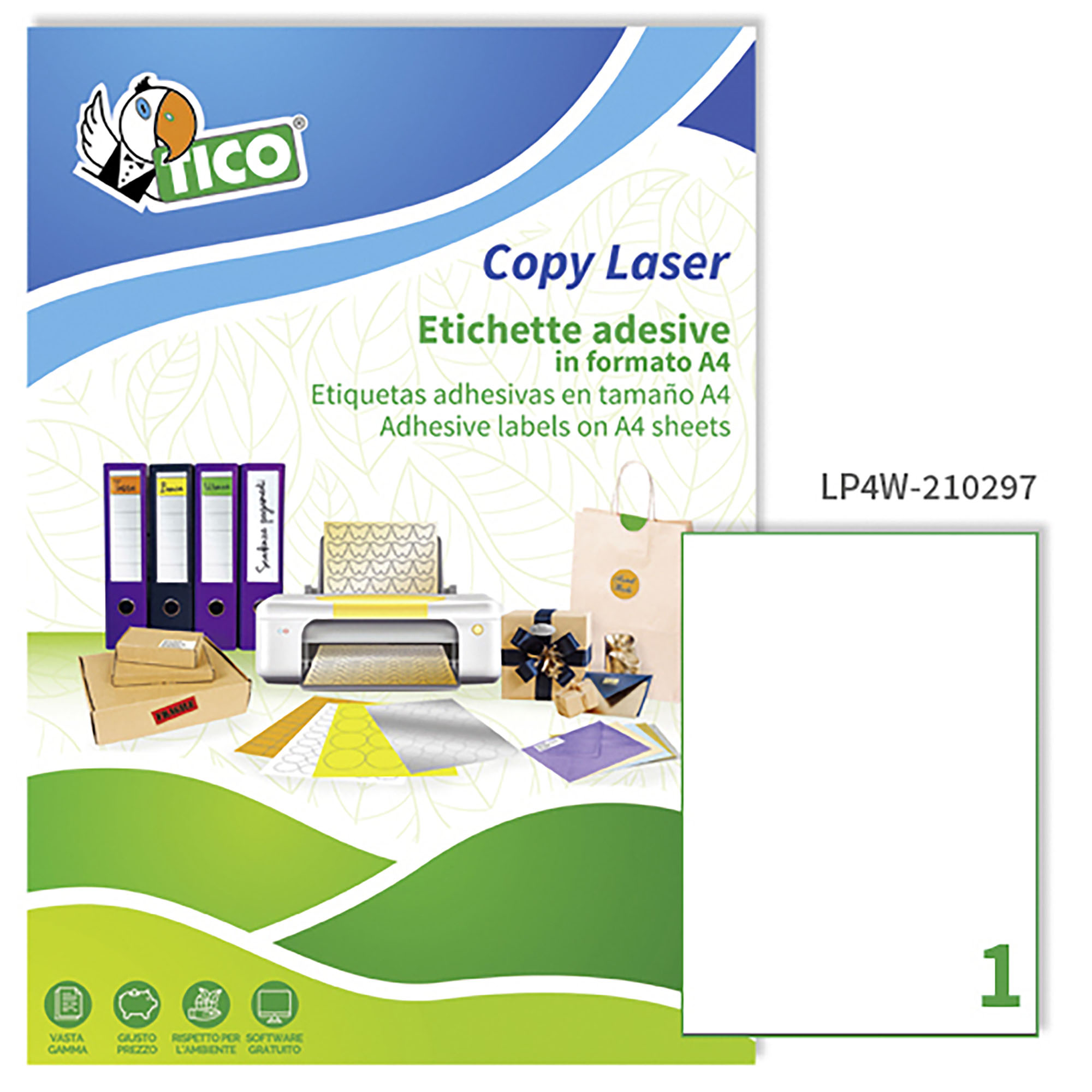 Detailled descriptionEtichette autoadesive Tico 210x297 in carta bianca 1 etich/foglio 100 etich/pacco