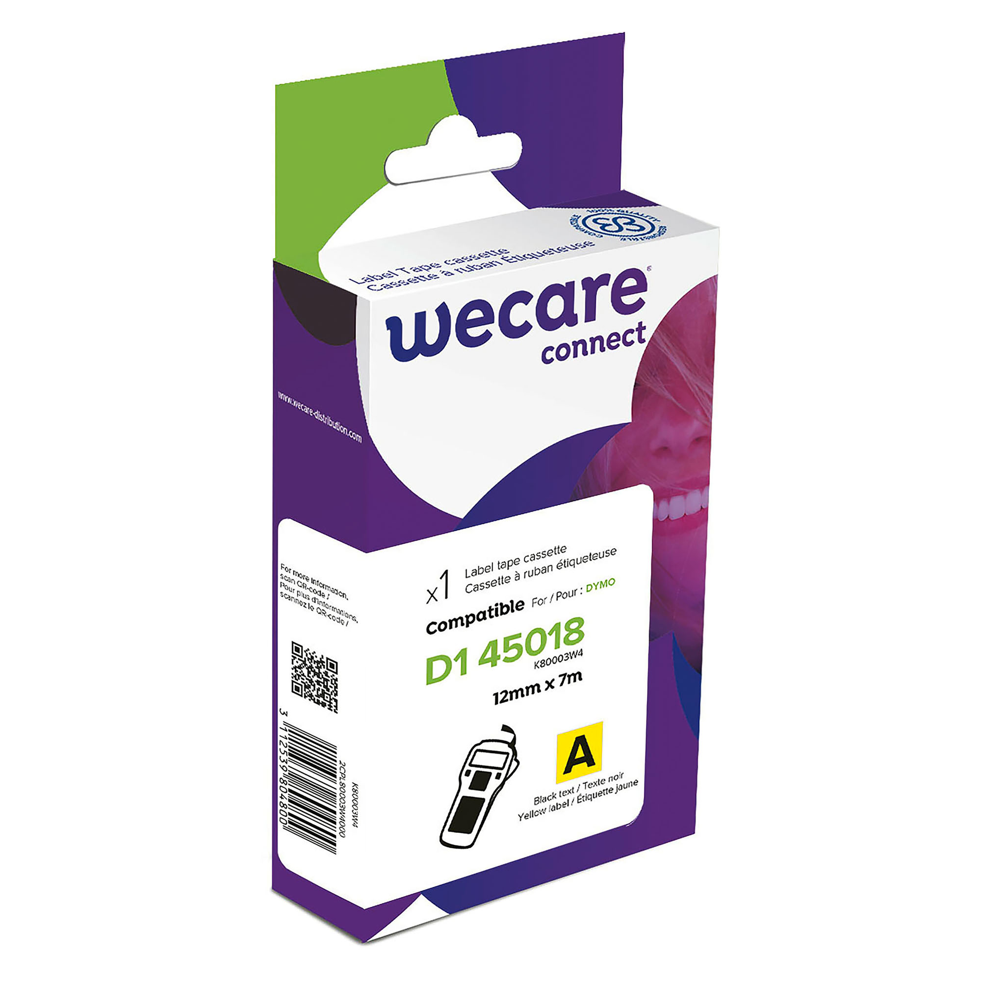 Detailled descriptionWeCareEtichette WeCare compatibili con D1 12mm x 7m Nero su sfondo gialloEtichette autoadesive che aderiscono a quasi tutte le superfici.Colore scrittura: NeroSfondo nastro: Giallo.Lunghezza nastro: 7 m.Larghezza nastro: 12 mm.