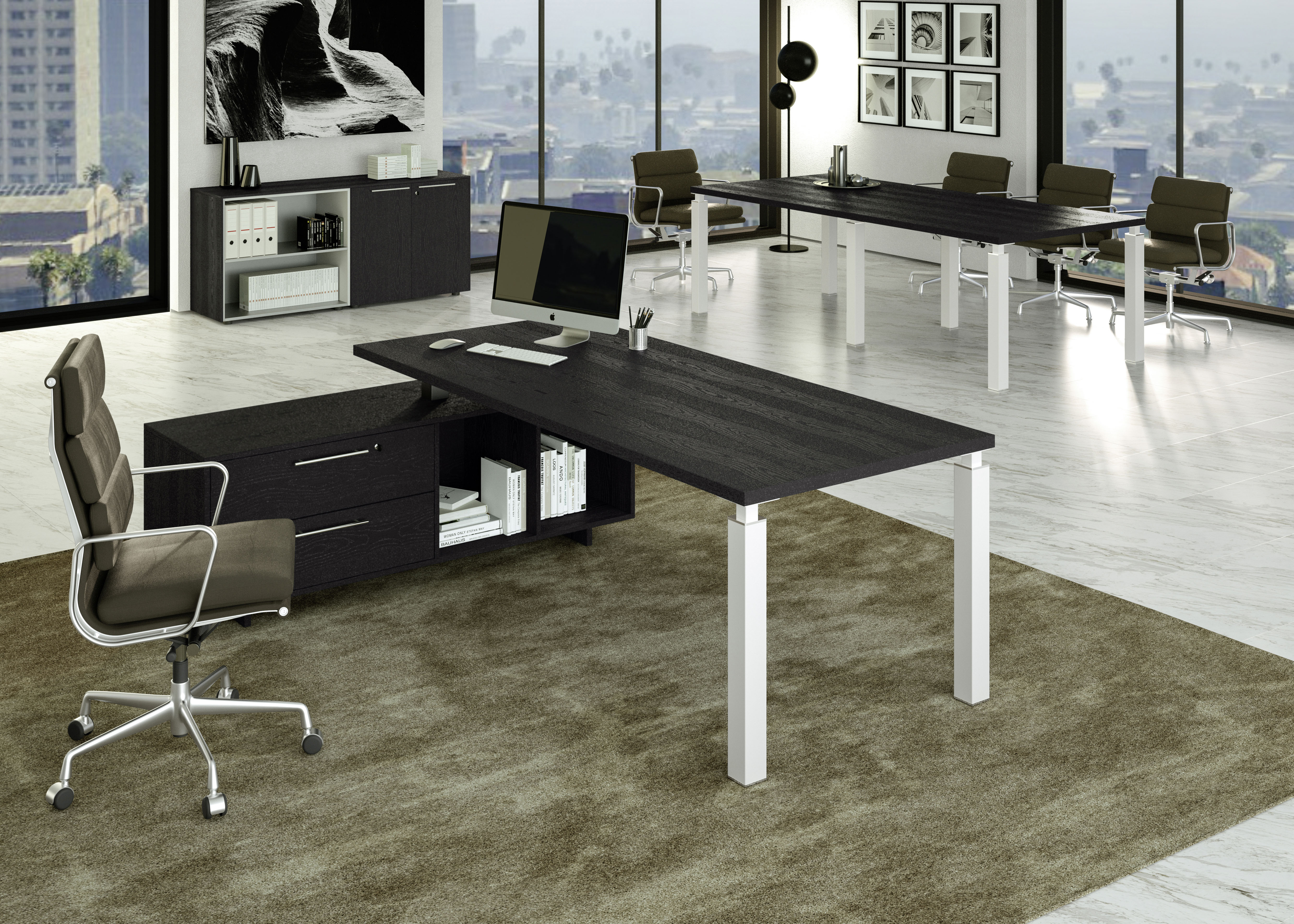 The desk can be coordinated with other components in the line: meeting table, sideboard, drawer units, low, medium, and high cabinets.