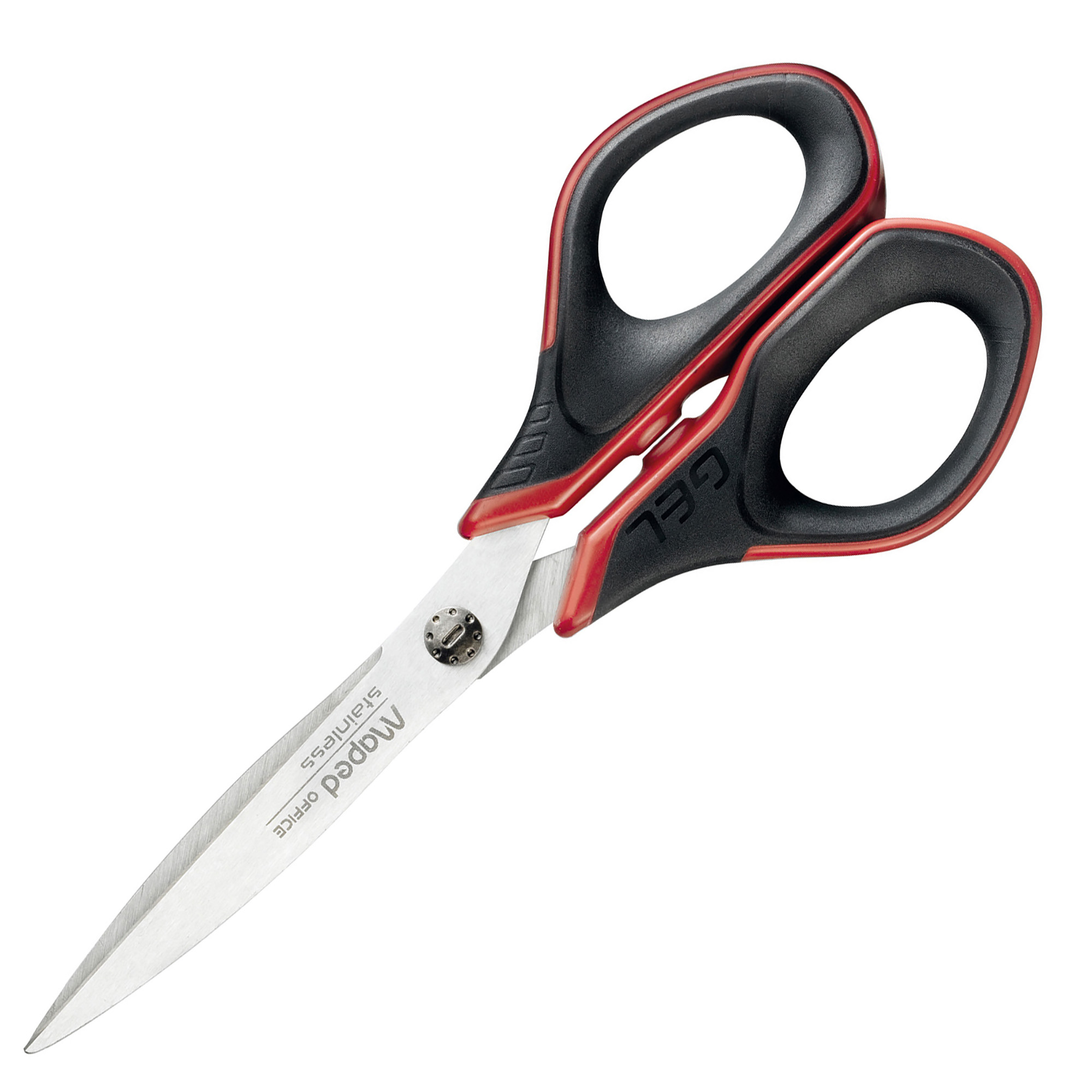 Forbici con lame e rivetto in acciaio inossidabile, anelli ergonomici bi-materiale con nuovo materiale soft gel innovativo.