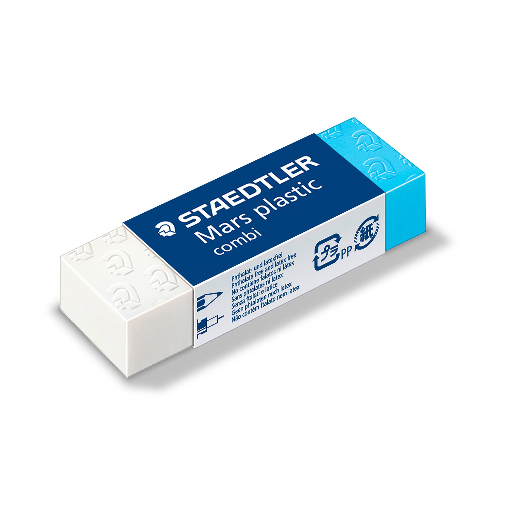 • Gomma bianca/blu in plastica per matita e china, forma rettangolare • La parte
