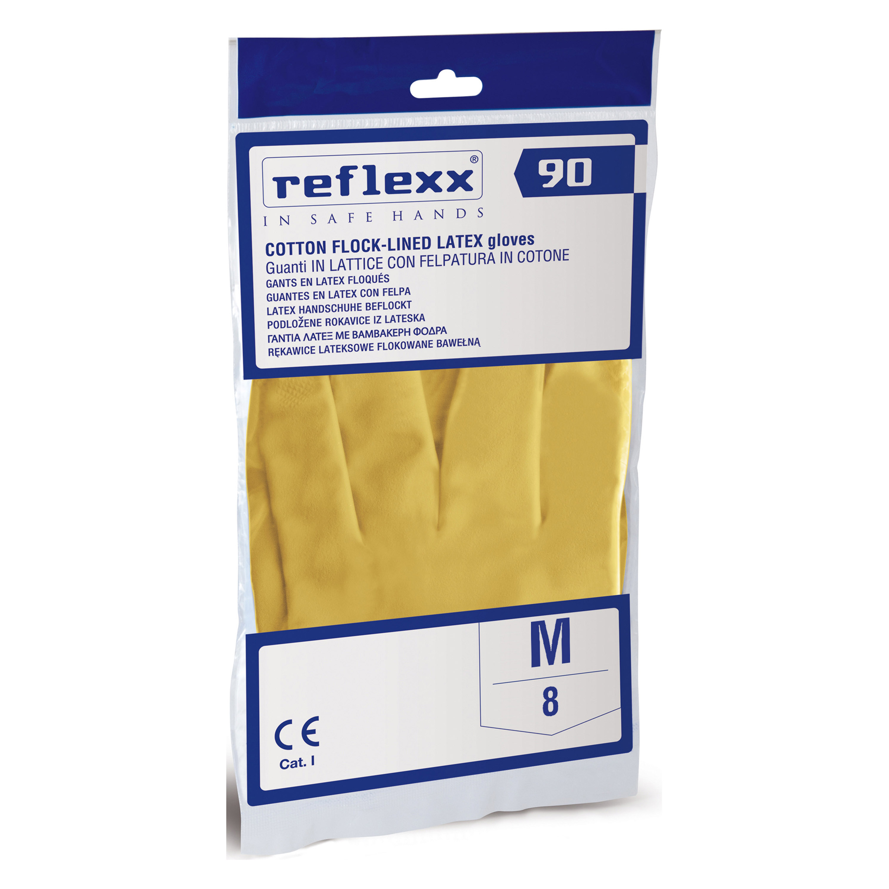 Guanti riutilizzabili di colore giallo in lattice di gomma con bordino antigoccia. Finitura con felpatura interna in cotone e zigrinatura antiscivolo sulla superficie esterna.