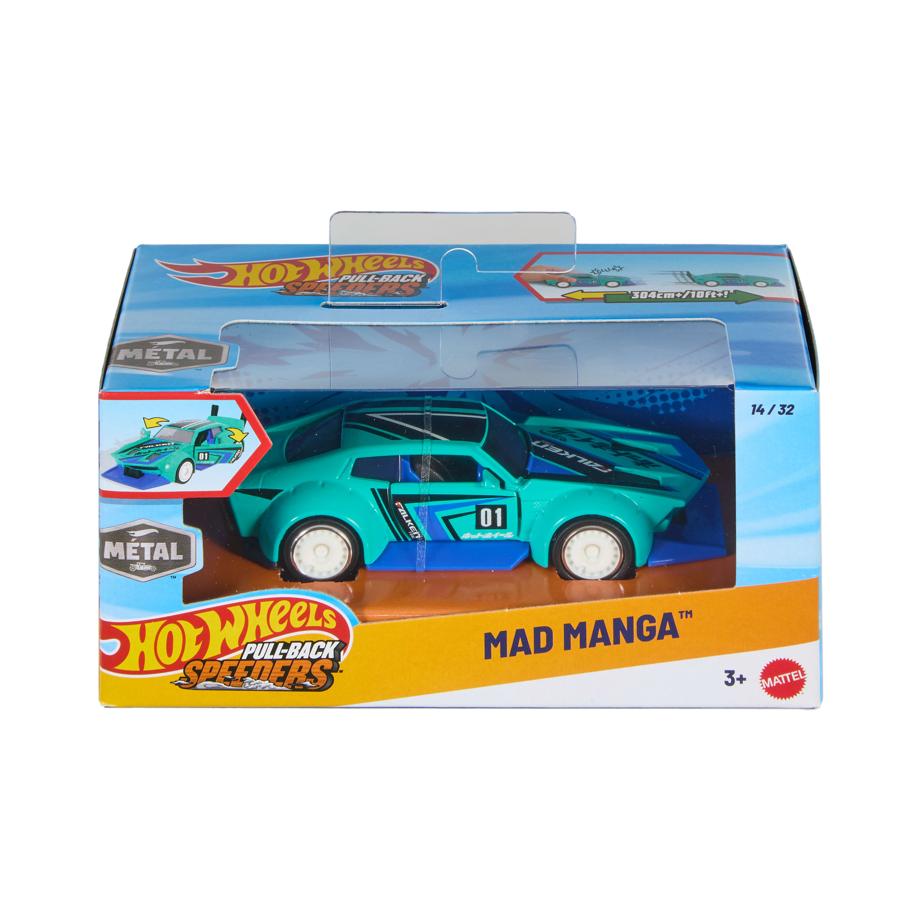 Pull these Hot Wheels cars back and let them race with awesome speed, style and performance. These larger-than-usual Hot Wheels die-cast vehicles are 1:43 scale with authentic decos. Each one includes an interactive feature such as Rolomatics, which show off the engine's movements, or doors or hoods that open. With such cool details, the storytelling possibilities are endless kids and collectors will want them all. Each sold separately, subject to availability. Colours and decorations may vary.